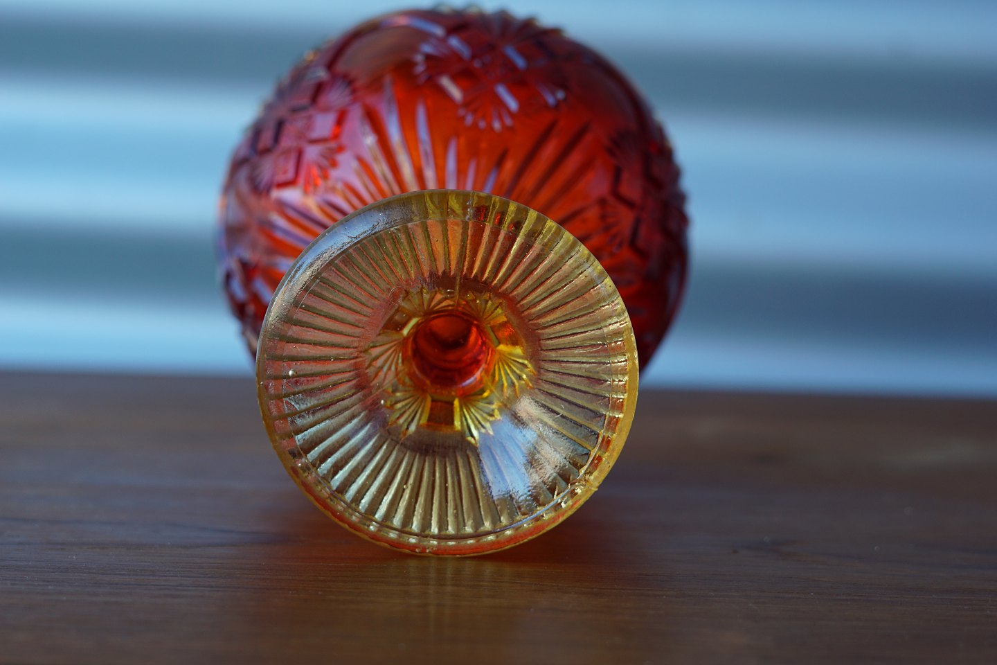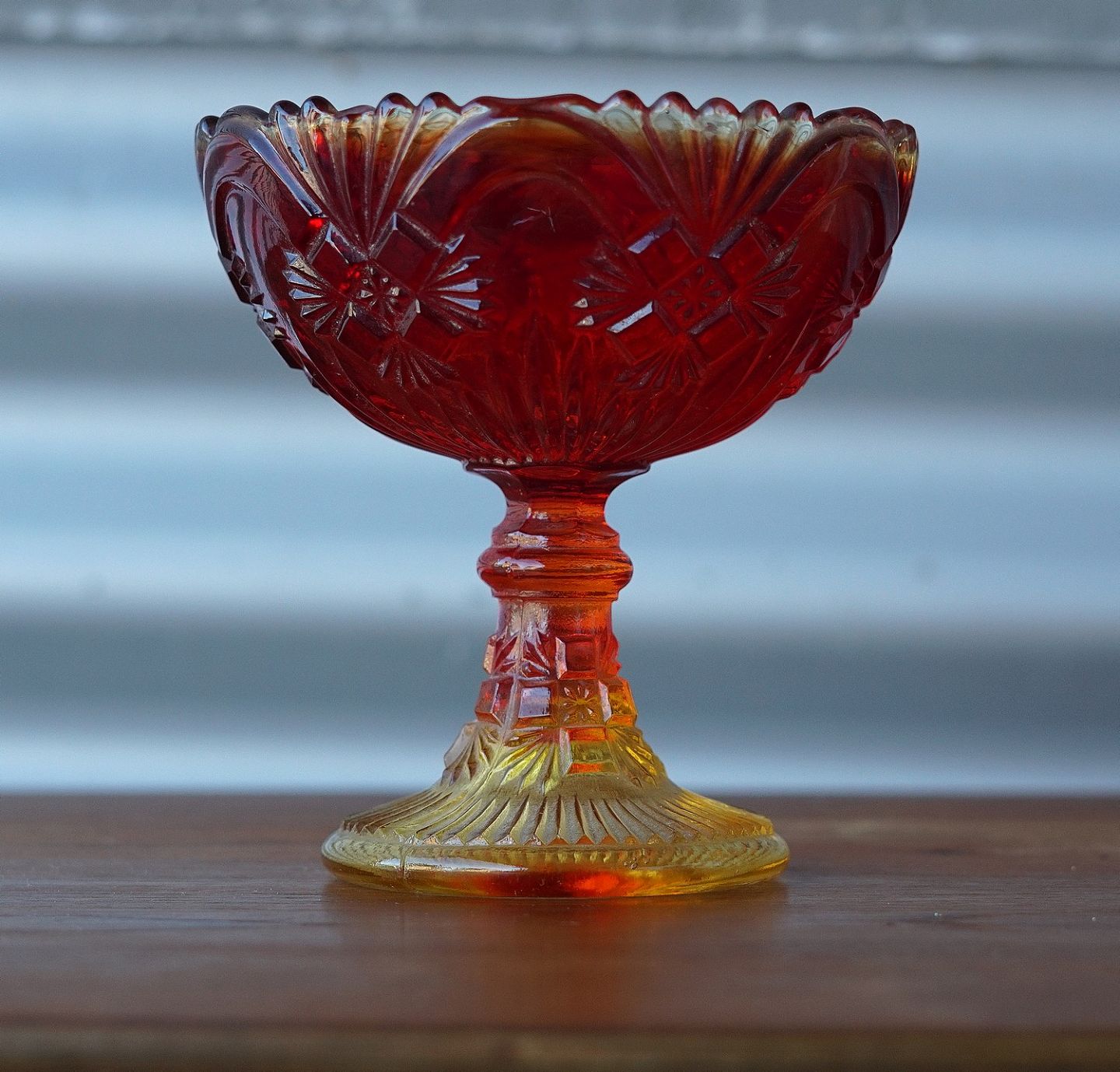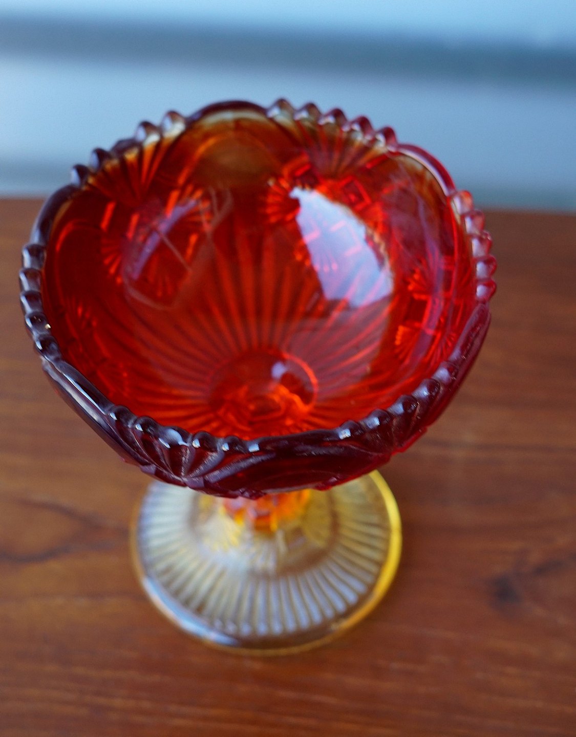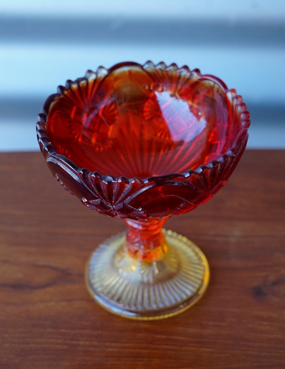Glas opsats fra Fyens Glasværk, opsatsen er i presset glas. Skålen, på opsatsen, er rød og stilken er gul, farverne fader ud fra rød til gul