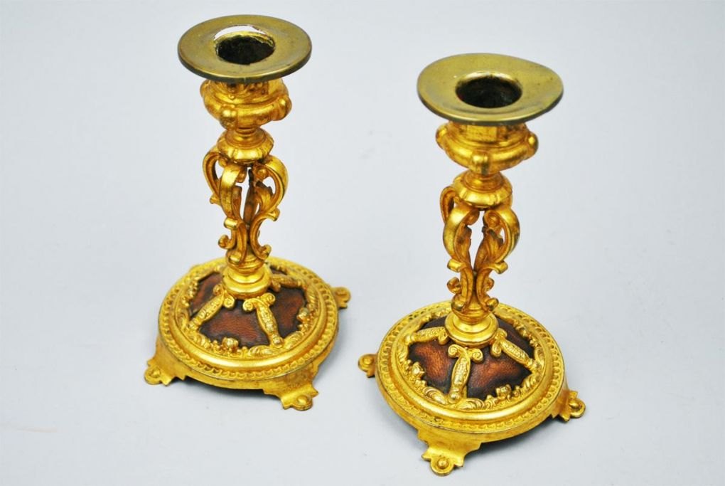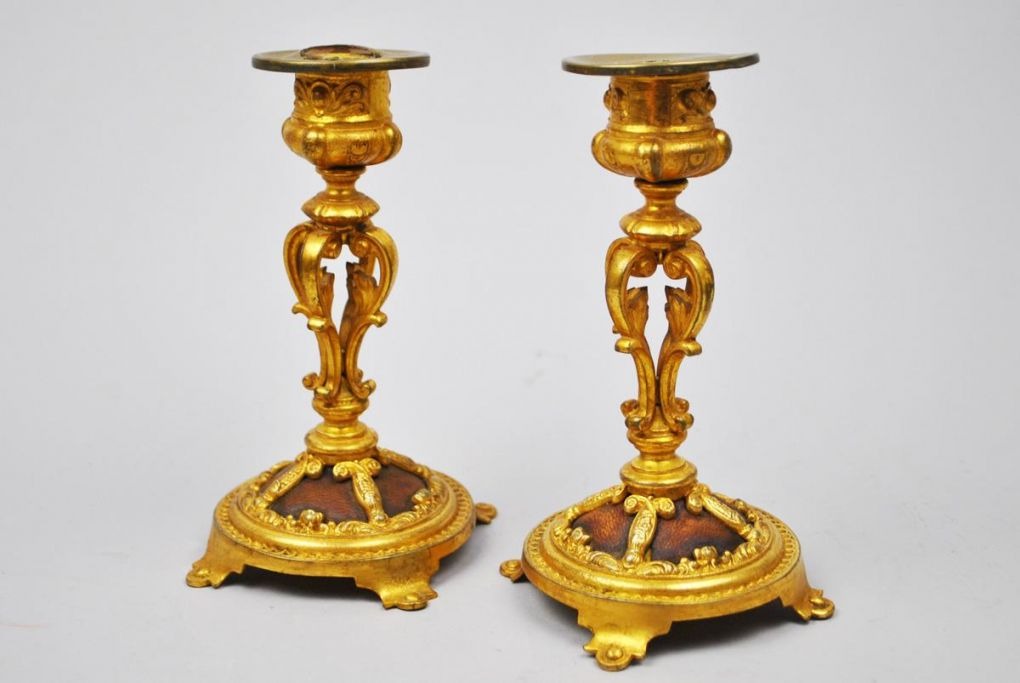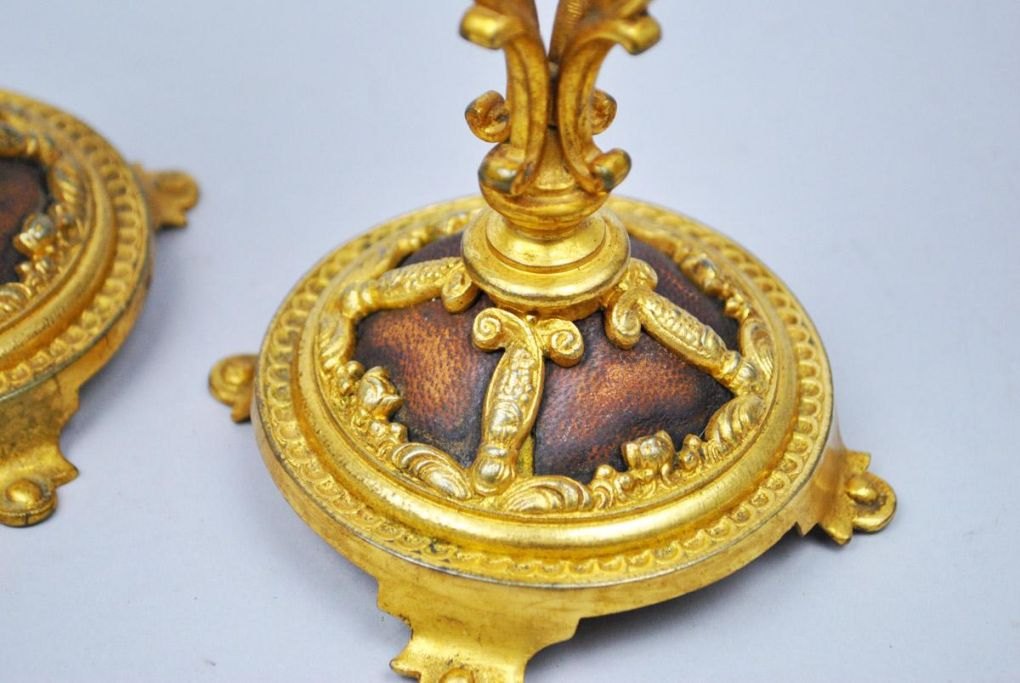 Pair of French gilded chandelliers, new rococo, 19th century. With leather on foot. Height: 16 cm.