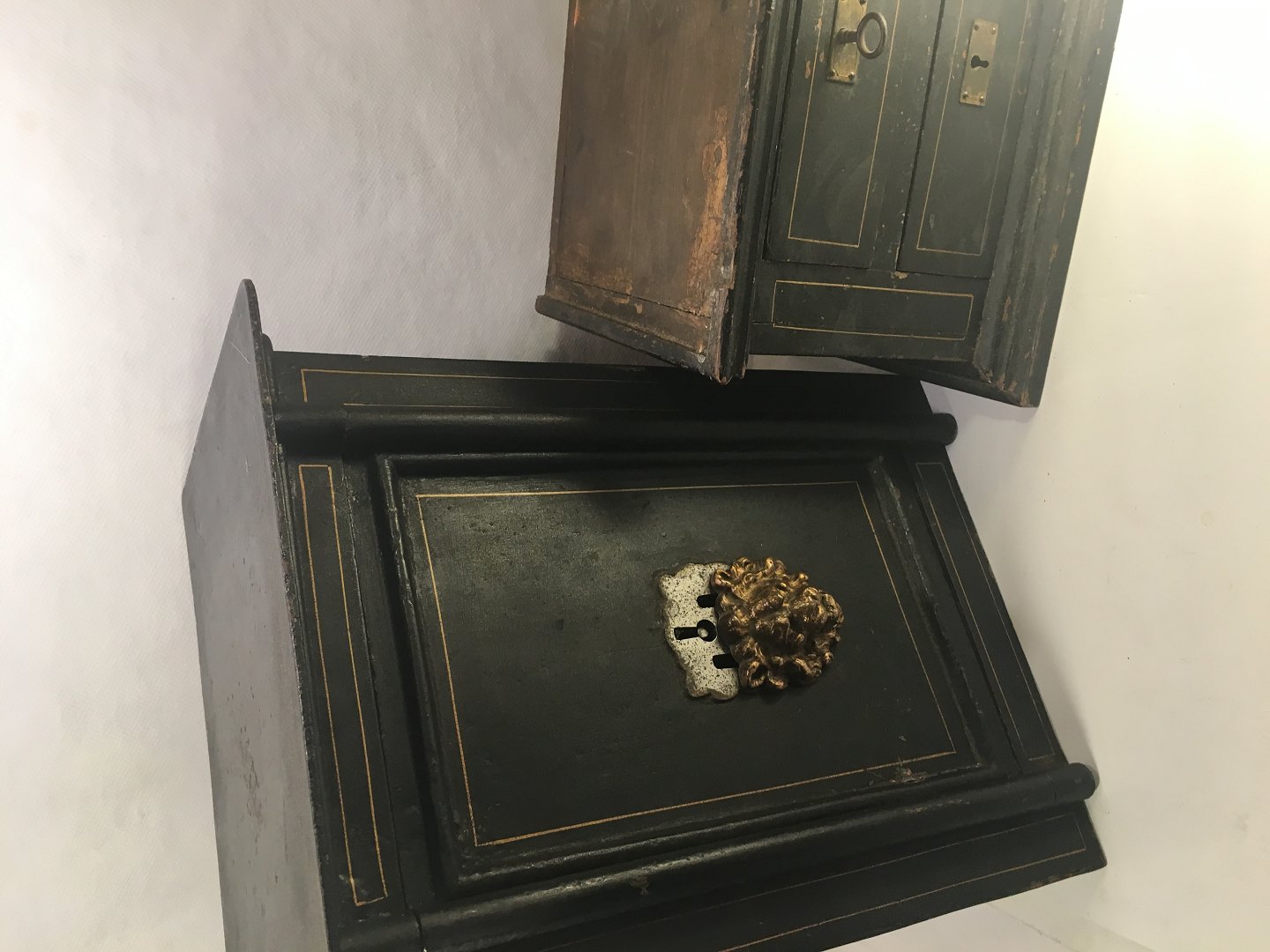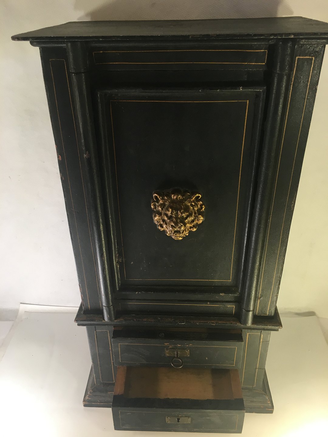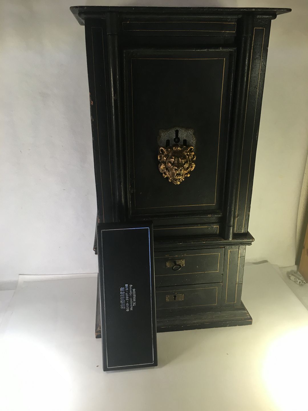 Gammelt unika pengeskab i miniature. stående på træ sokkel. med 2 skuffer.