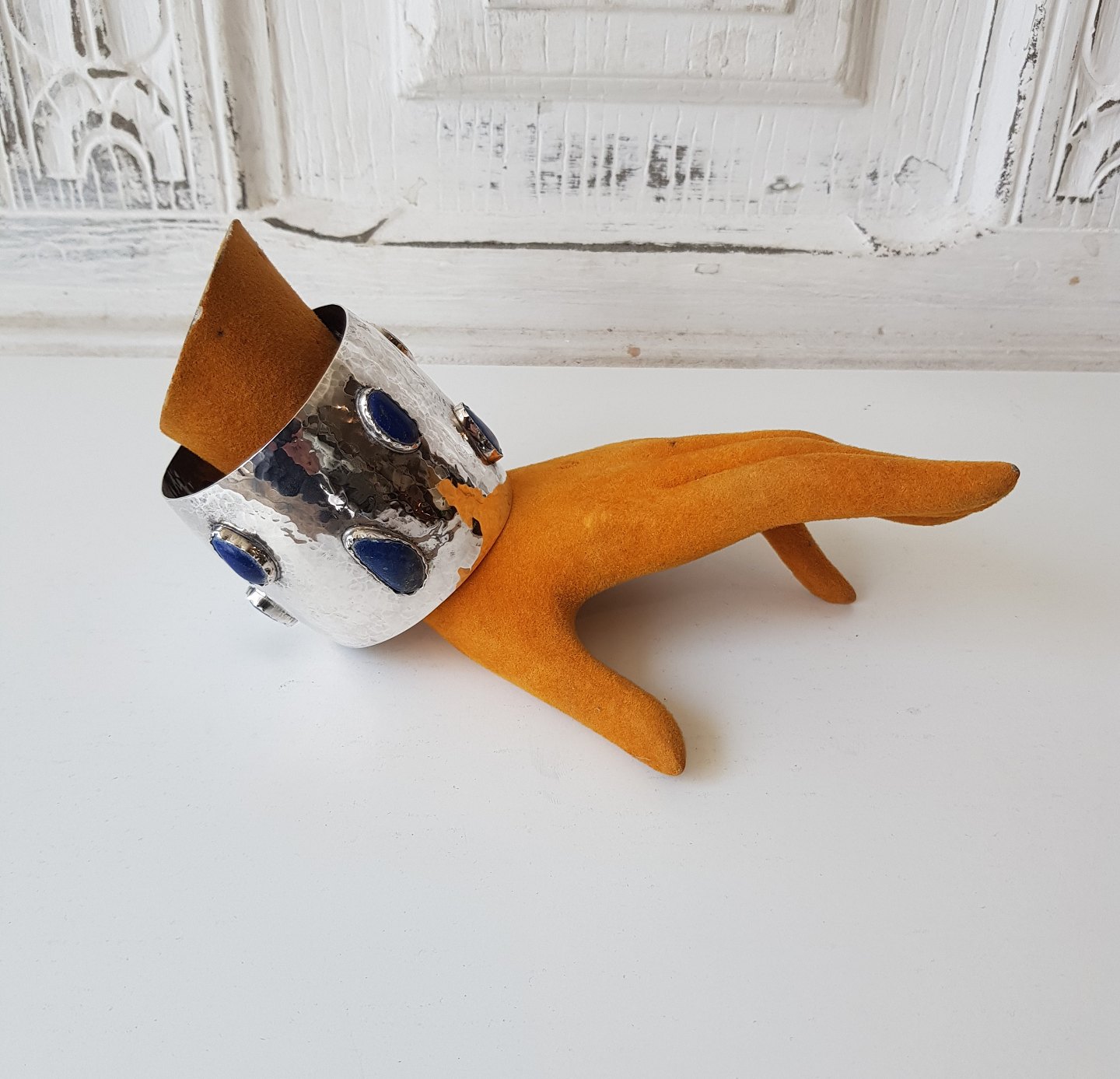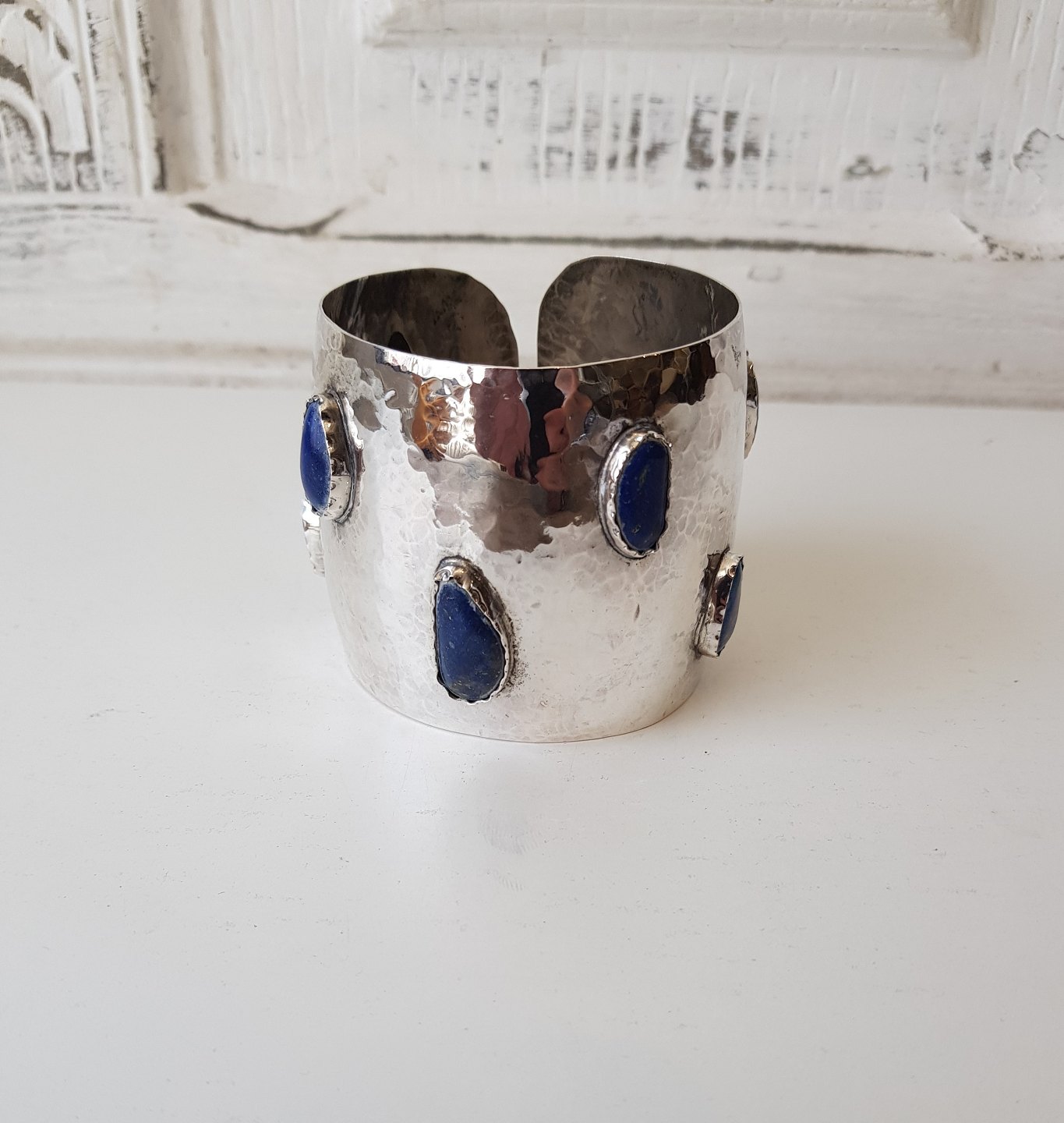 Bredt hammerslået sølv armring prydet med lapis lazuli.