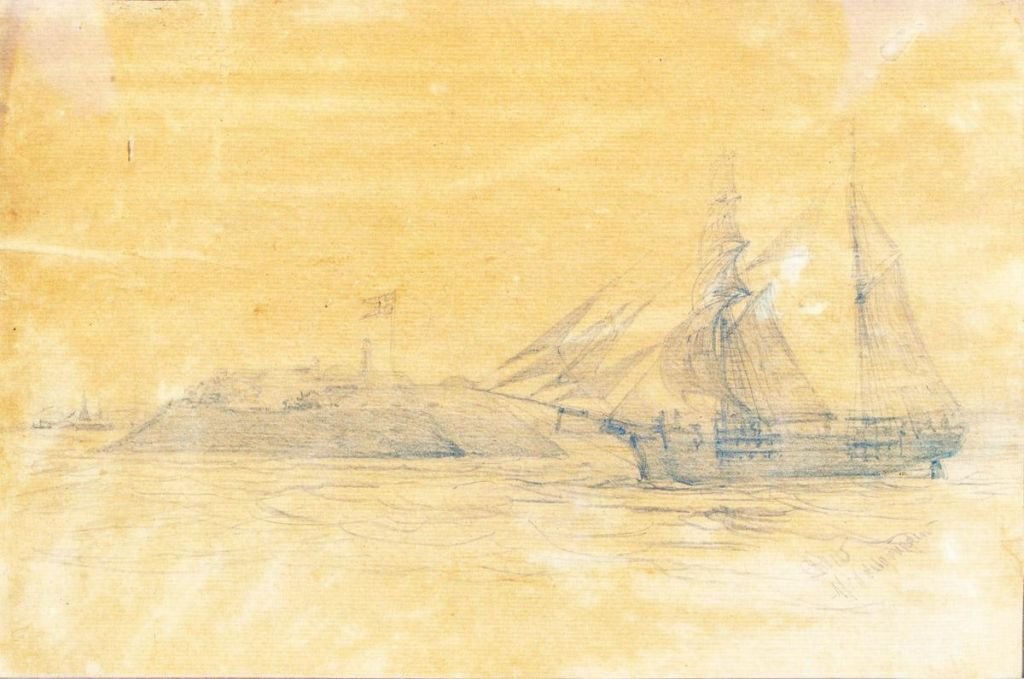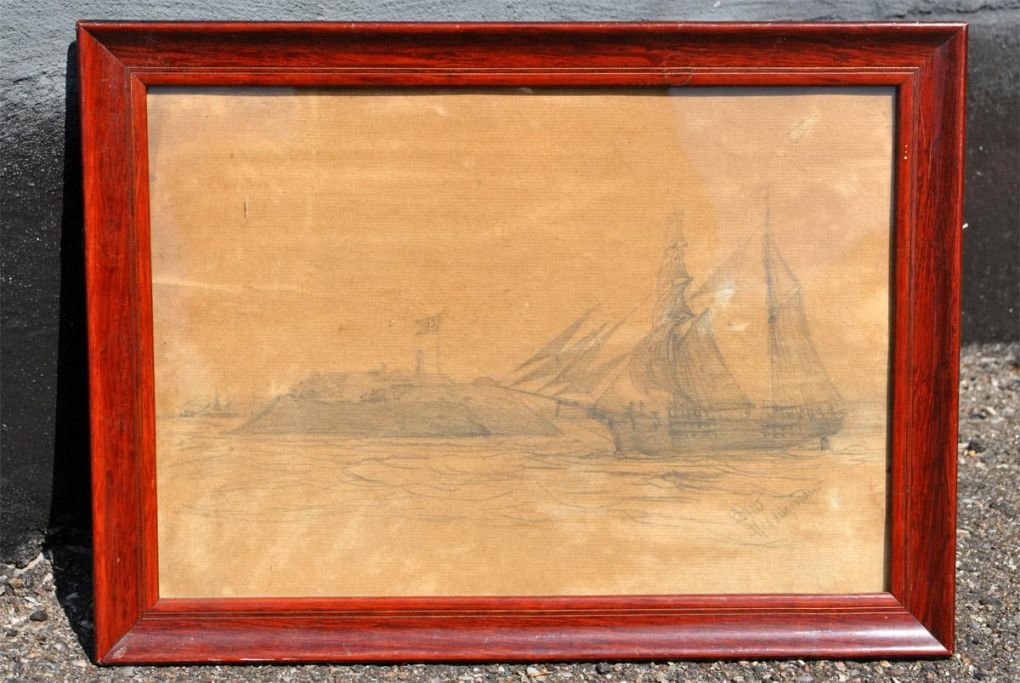 Riis Carstensen, Andreas (1844 - 1906): Sailing ships with Middelgrundens Fort at the entrance to Copenhagen. Lead on paper. Monogrammed. 25 x 34 cm.