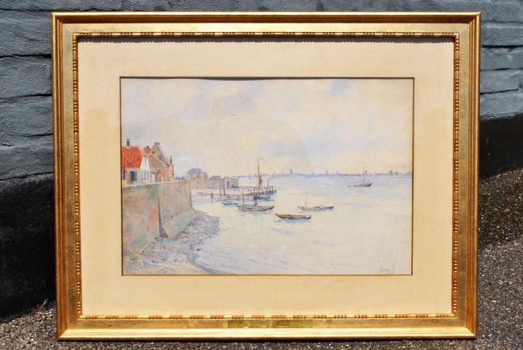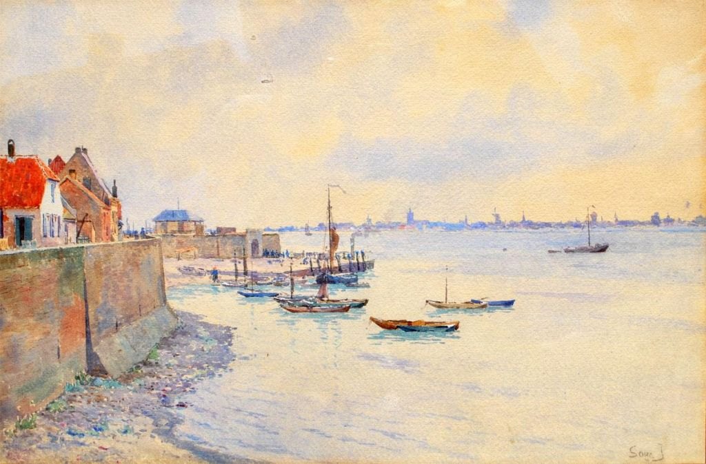 Soya-Jensen, C. M. (1860 - 1912) Danmark: Parti fra en by ved Den Engelske Kanal. Akvarel. Signeret: Soya J. 33 x 48 cm.