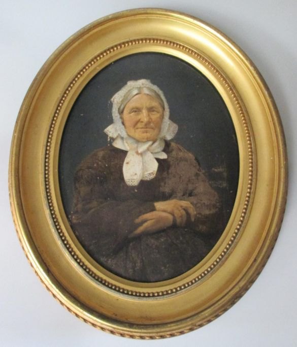 Fritz, Andreas (1890 - 1983) Danmark: Portræt af kunstnerens moder. Bemalet fotografi. Usigneret. Oval ramme. 39 x 33 cm.