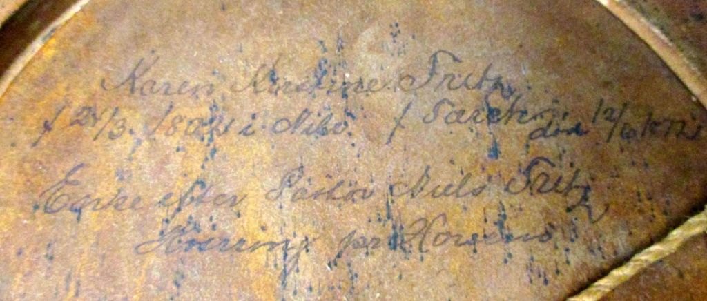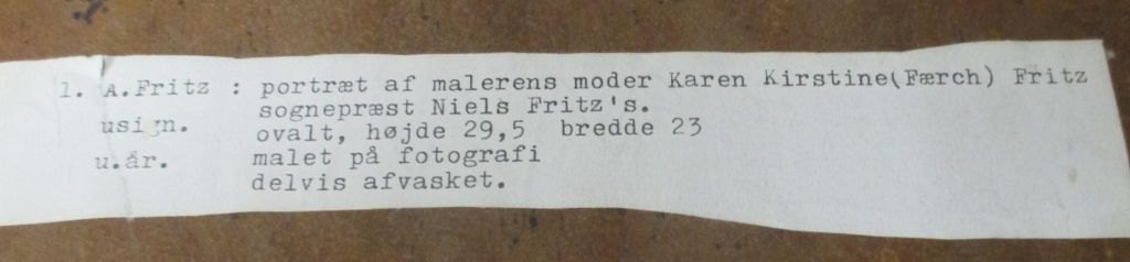 Portræt af kunstnerens moder Karen Kirstine født Færch. Født den 24.03.1802 i Nibe. Død 12.6.1872. Enke efter Paster Niels Fritz, Hvirring pr. Horsens.