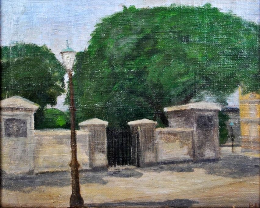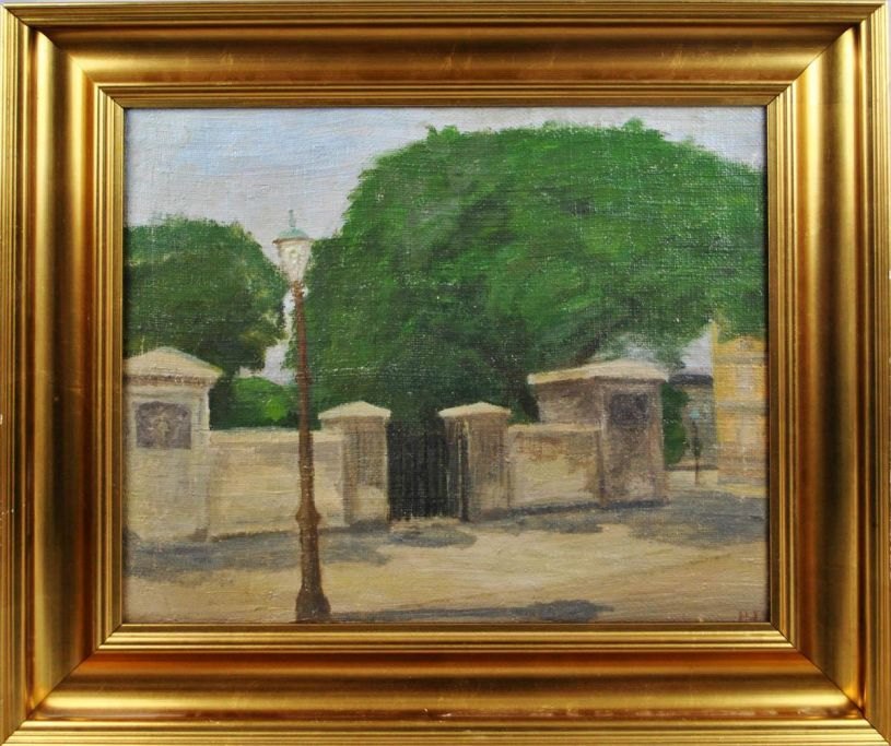 Jensen, Helge (1899 - 1986) Danmark. Parti fra en by med klassisk mur. Signeret: Monogram. Olie på lærred. 34 x 40 cm. Indrammet.
