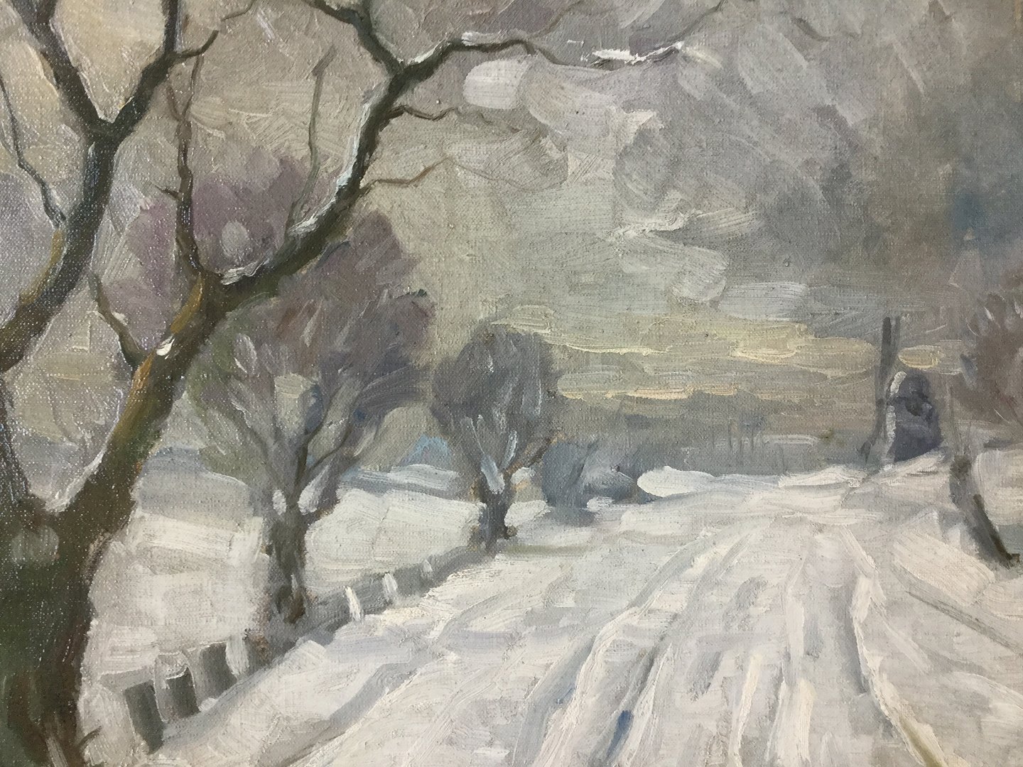 Maleri af Jens Sinding Christensen - Vinterparti med mølle ved vej og nøgne træer.