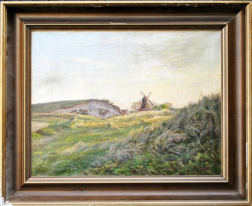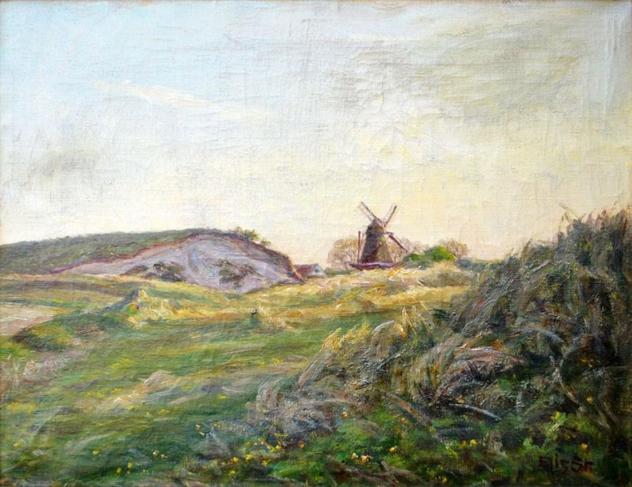 Schiøtt, Elisabeth (1856 - 1938) Denmark. Dronninge Mølle seen from the dunes in Villingebæk. Signed: ElisSt. Oil on canvas. 35 x 45 cm.