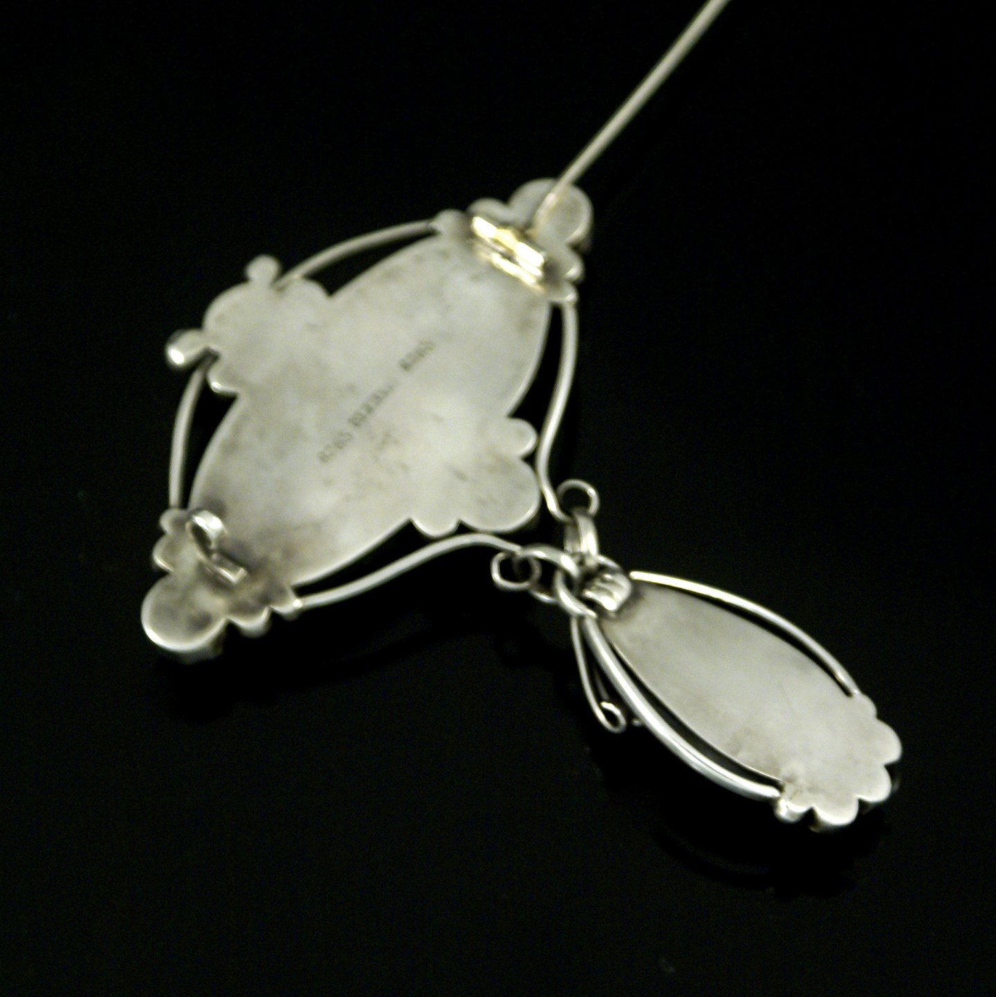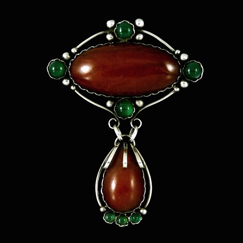 Otto Strange Friis. Skønvirke Broche i Sølv med rav og grøn agat.