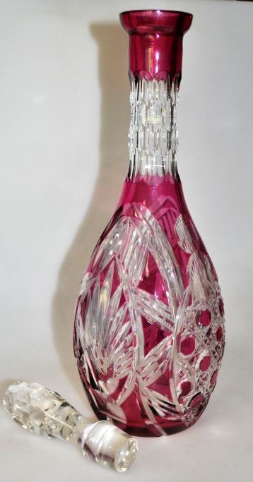 Bømisk krystal karaffel med prop, 20. årh. Rødt overfang med slibninger. Højde.: 40,5 cm.