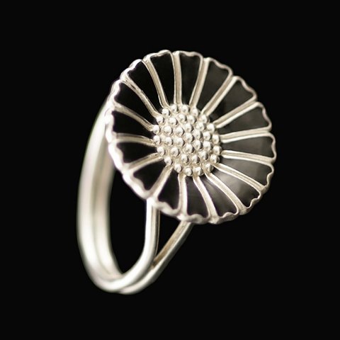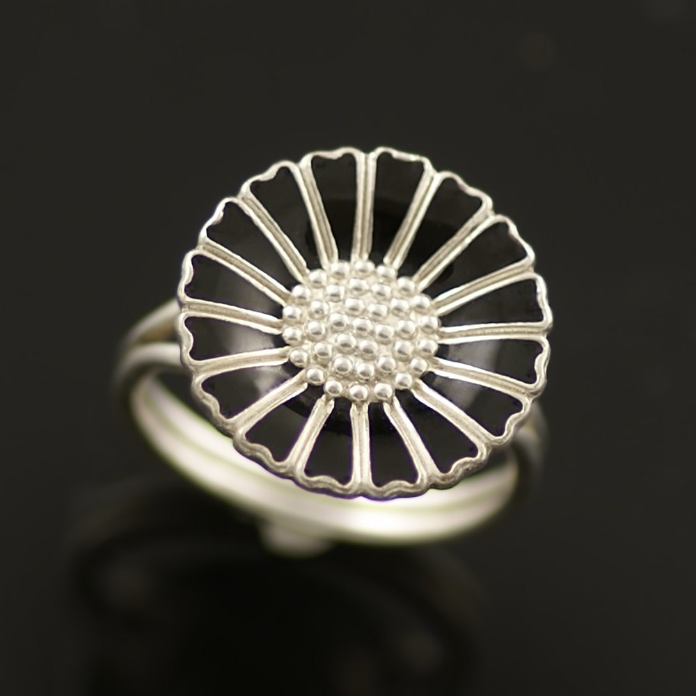 Bernhard Hertz. Danish Sterling Silver Daisy Ring with Black Enamel 18 mm.