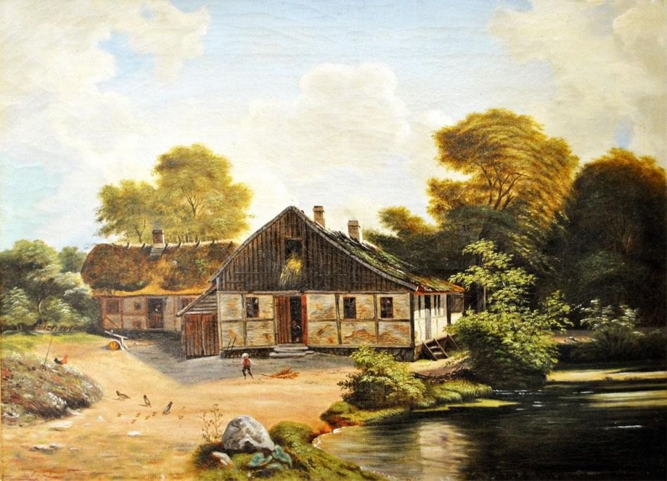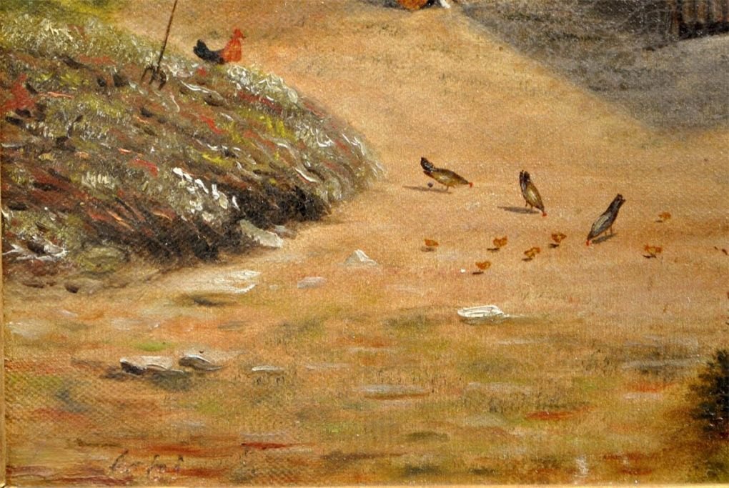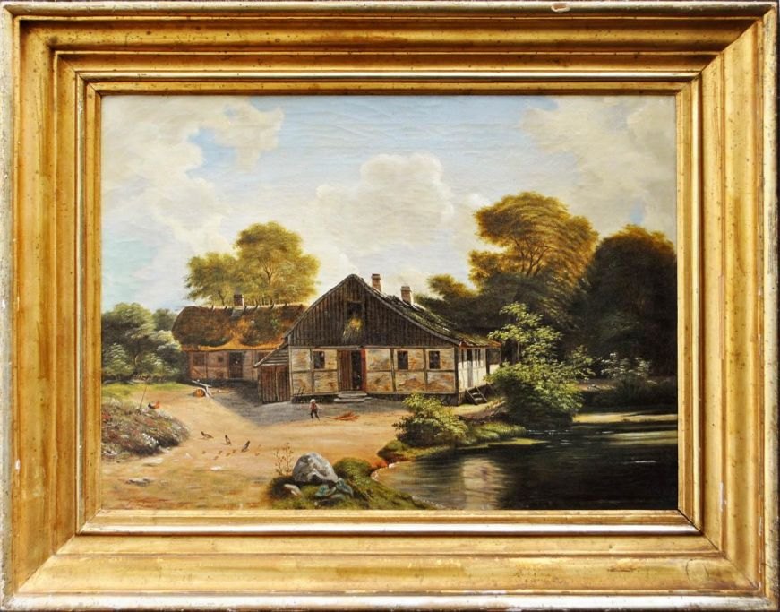Georg Emil Libert's Style (1880-1908): A little boy is playing in an old farm by a lake while hens run around. Oil on canvas. Faintly signed in the right lower corner of 1862. Oil on canvas. 37 x 50 cm. In Damborg frame.