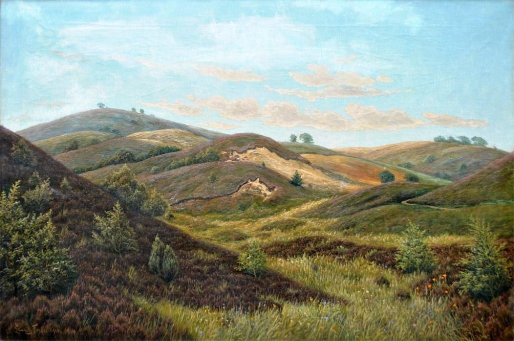 Frederiksen, Laurits (1857 - 1930) Danmark. Præstebakkerne ved Svejbæk. August 1914. Olie på lærred. 64 x 95 cm. Signeret: Laurits Frederiksen 1914.