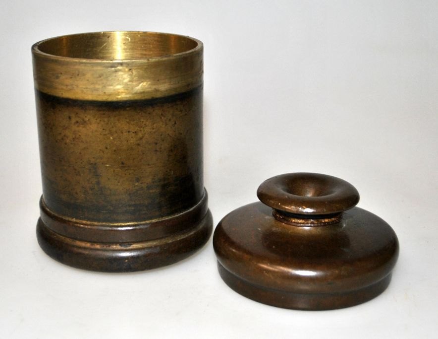 Messing cylinder med låg - antagelig garn nøgle, 20. årh. Danmark.