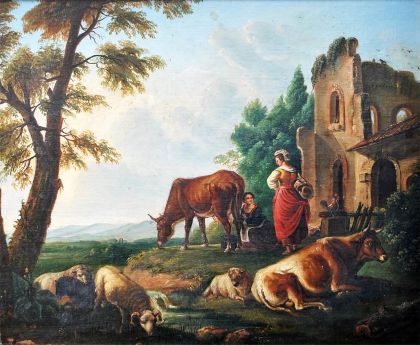Italiensk kunstner (18. årh.)  Kvinder i marken. Olie på lærred/plade. 40 x 48 cm.