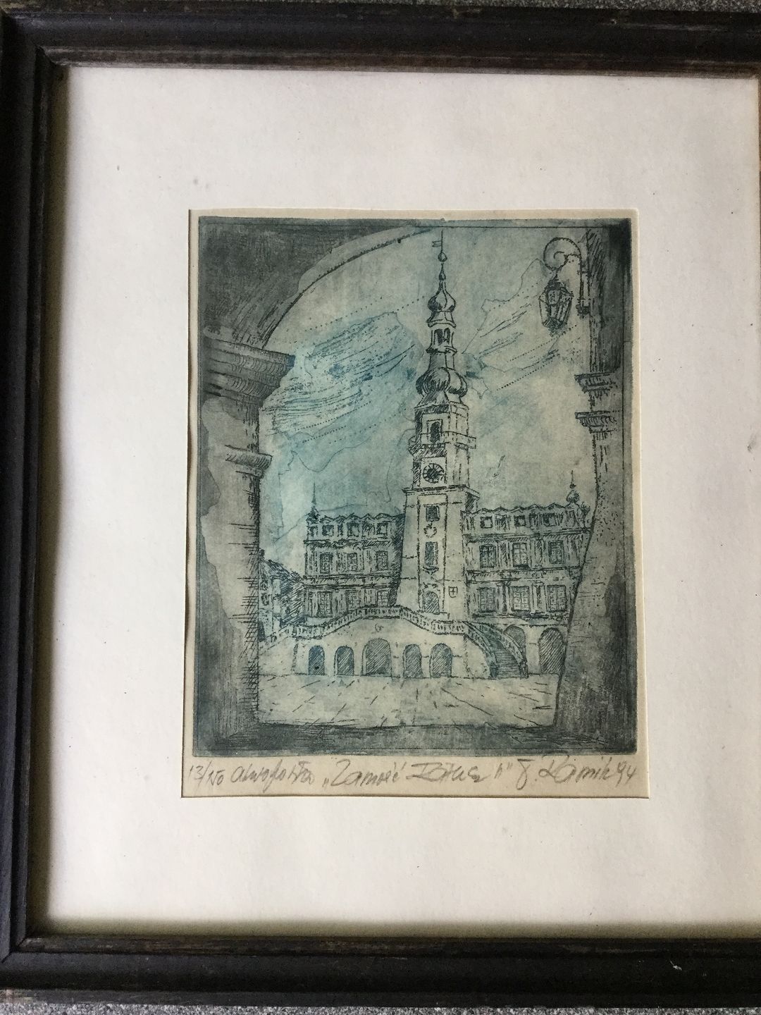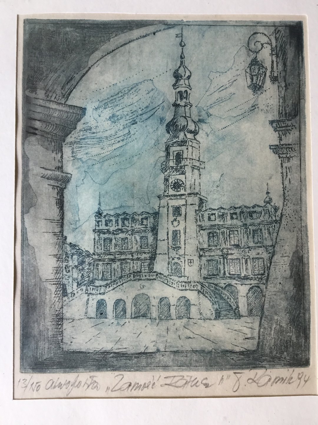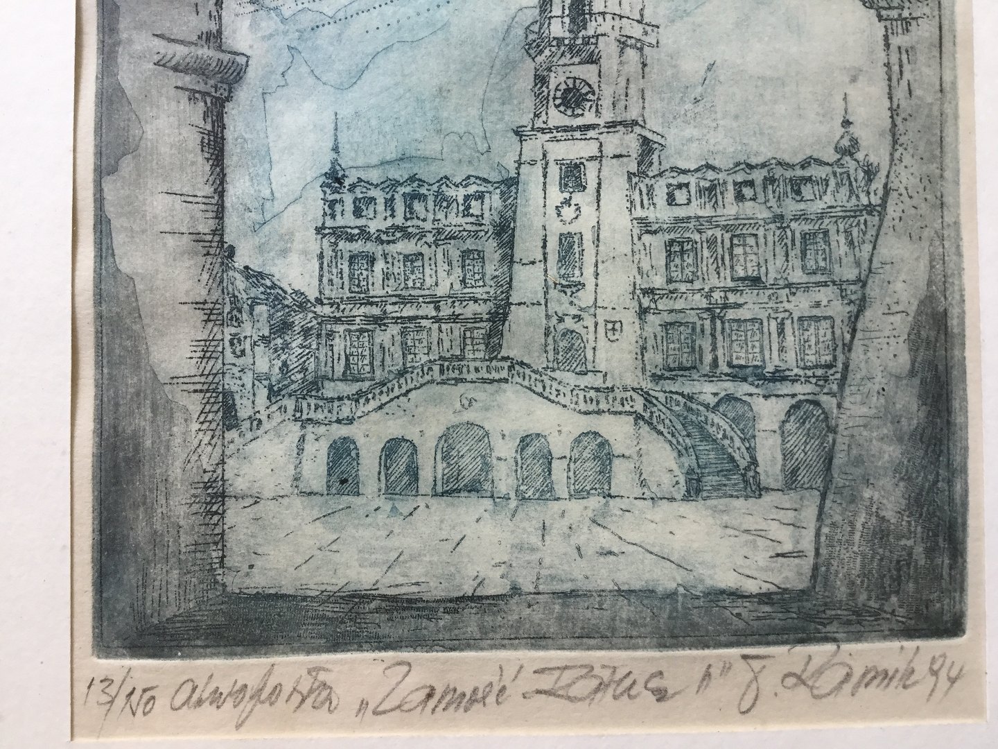 Radering - Hovedtorvet i Zamosc med rådhuset 1994.