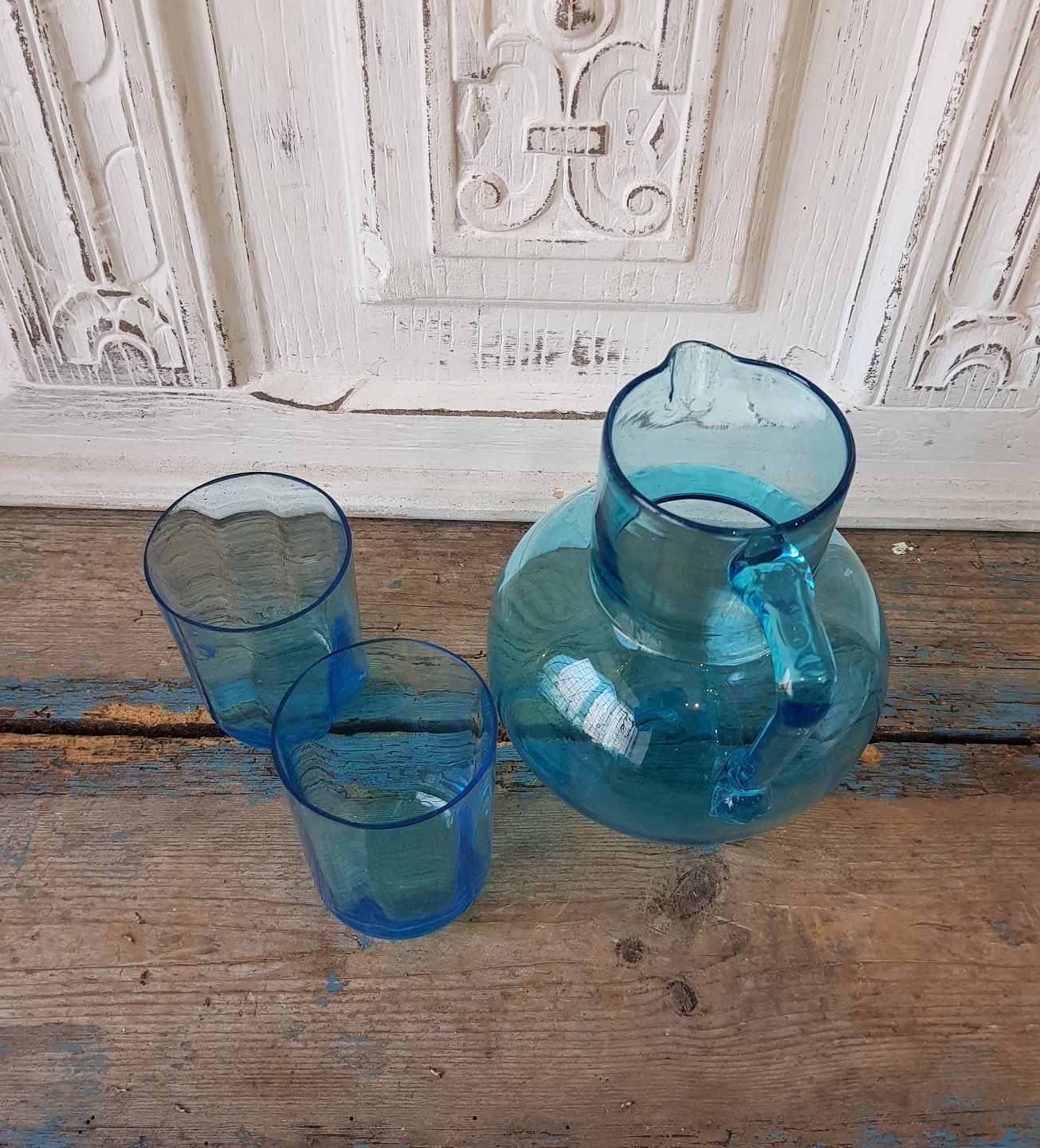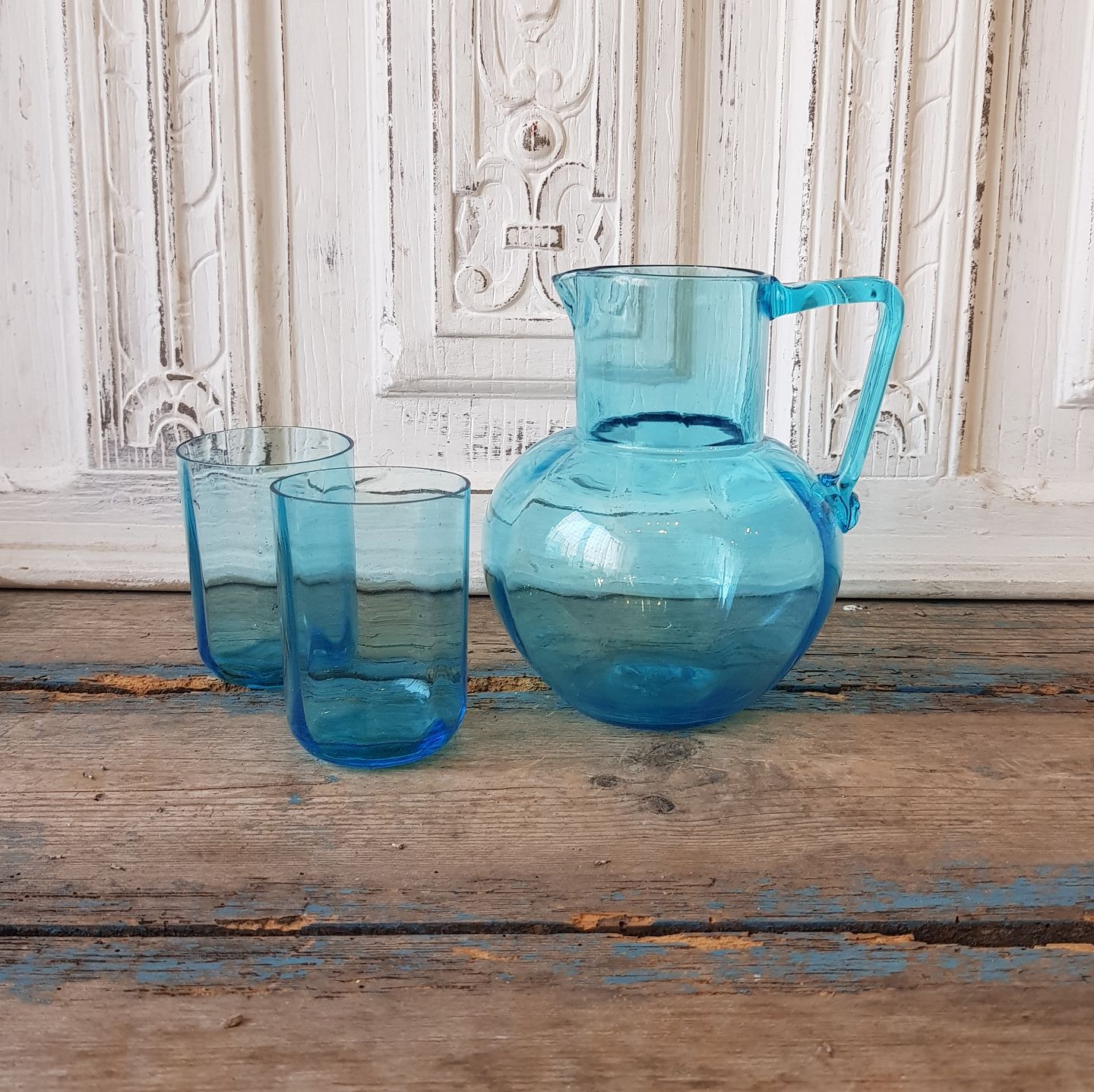 Søblå vandkande med 2 vandglas fra Fyens glasværk