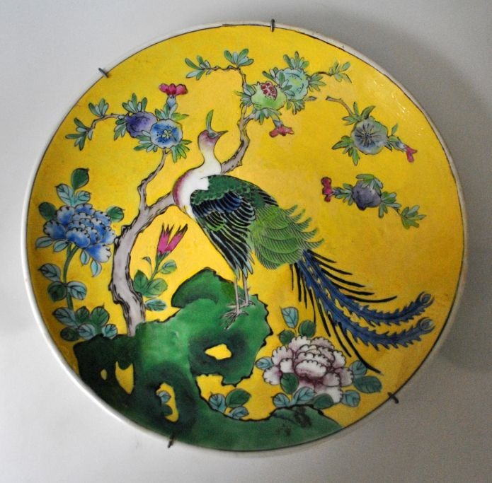 Japansk porcelæns fad, 20. årh. Håndbemalet, polykrom dekoreret med fugle og blomster. Dia.: 25 cm. Stemplet.
