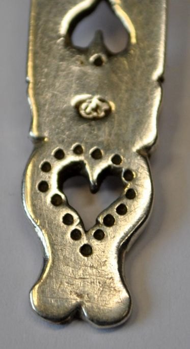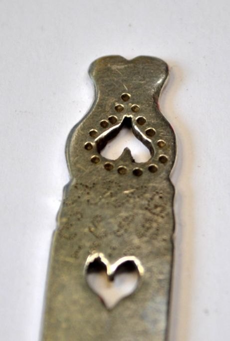 Meget sjælden norsk brude sølvske, barok, tidlig 19. årh. Dekoreret med hjerter. L.: 15,5 cm. Stemplet med mestermærke. Med indgravering: JPRG - ELJD 1816.