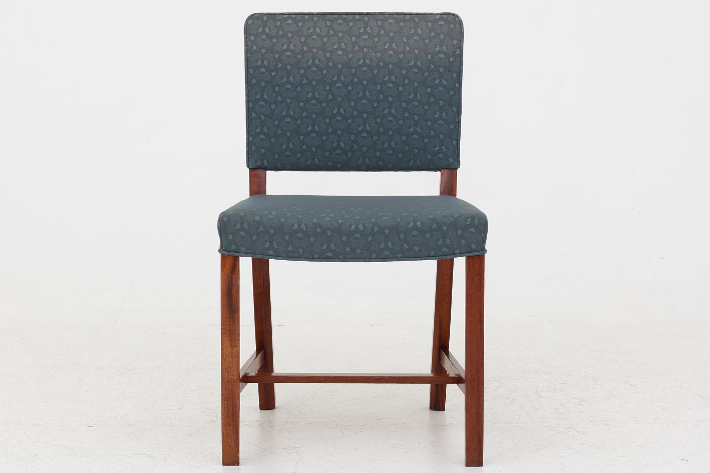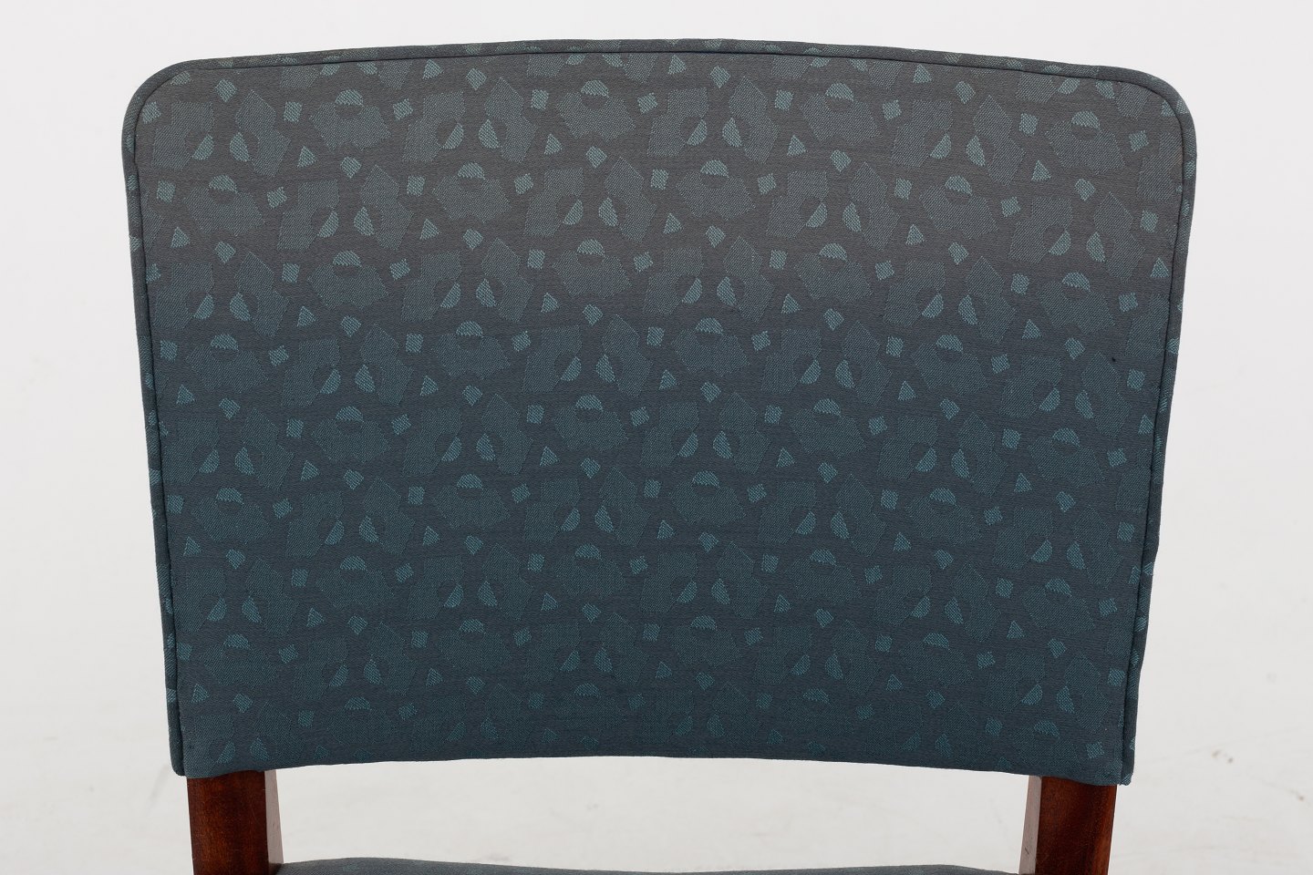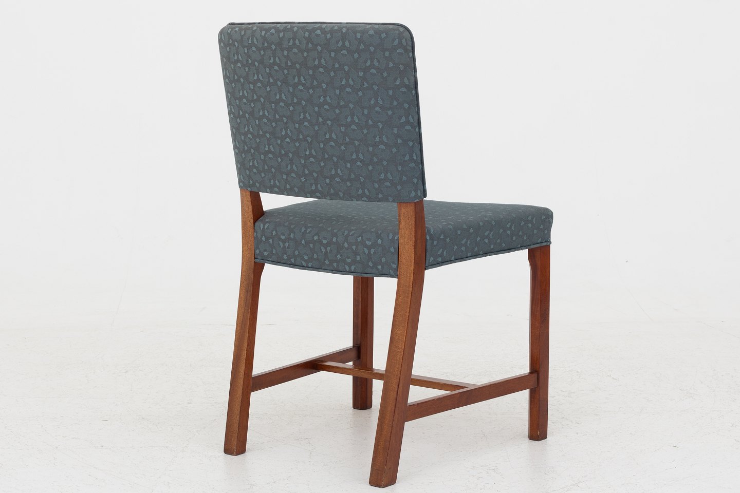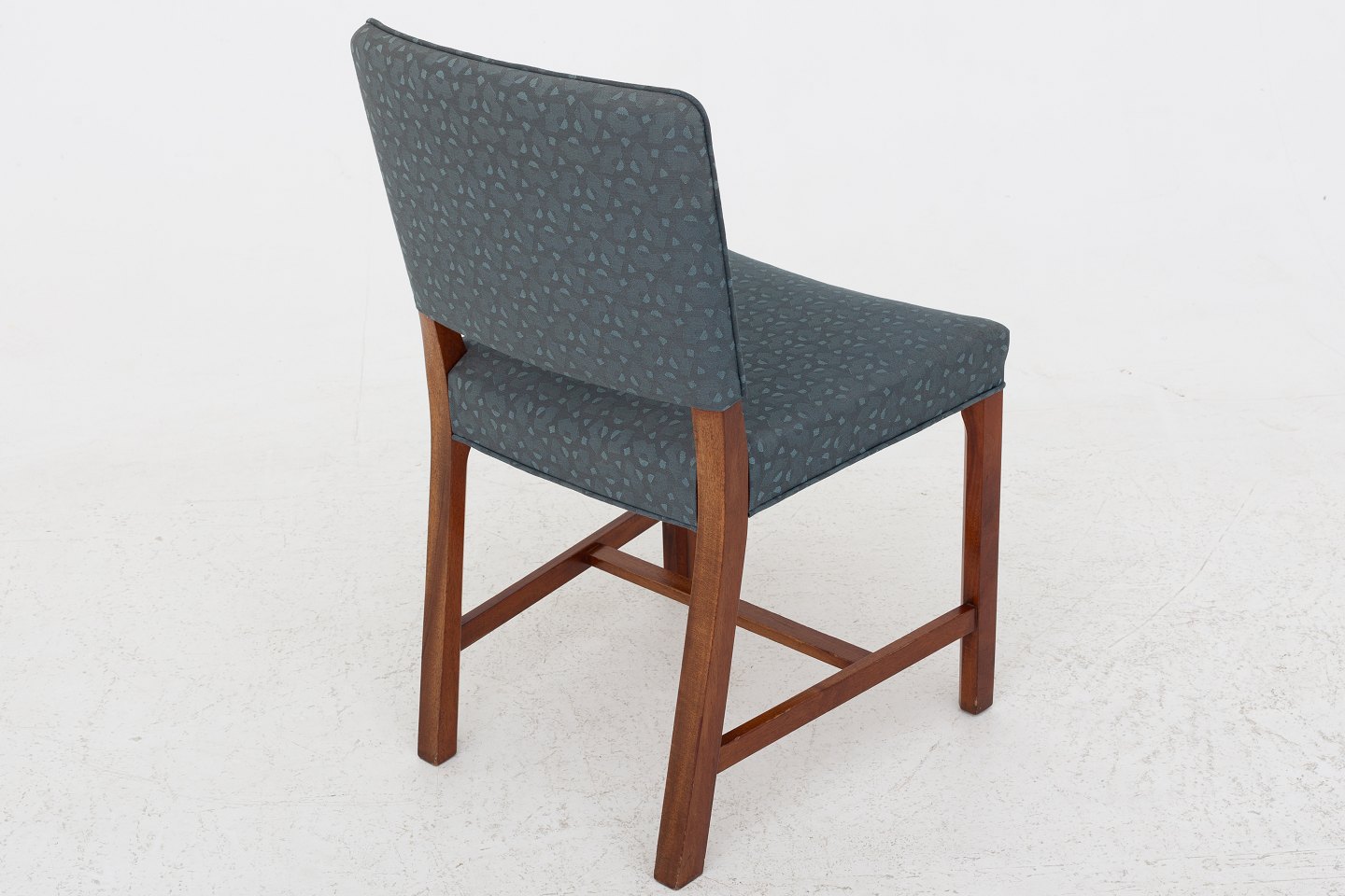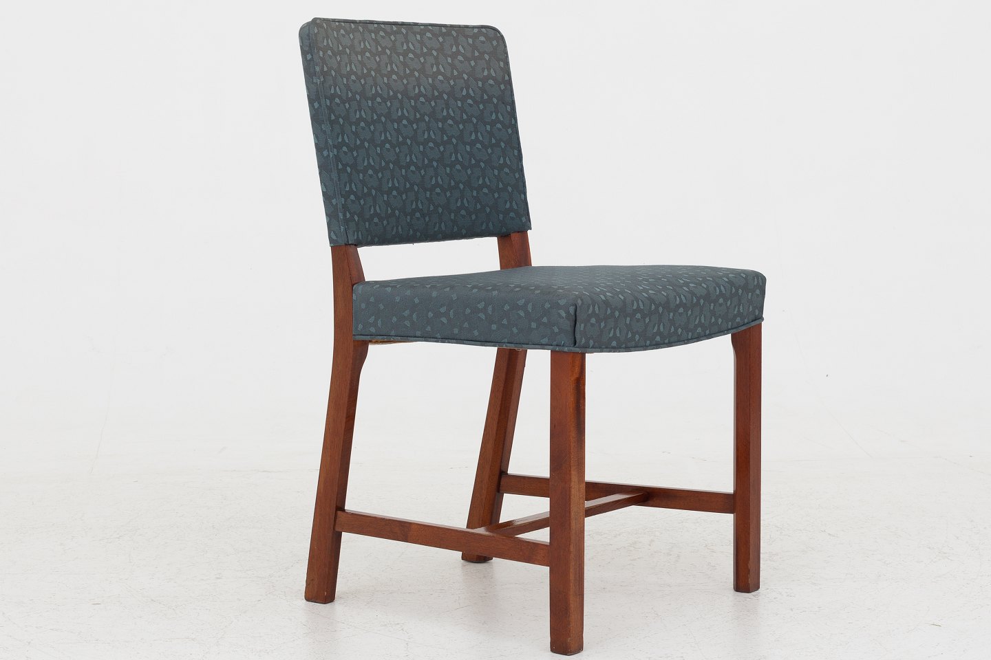 Spisestuestol i mahogni med originalt, mønstret betræk.