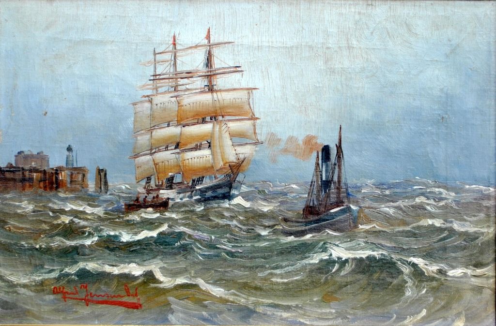 Jensen, Alfred (1859 - 1935) Tyskland: Lodsen fører sejlskibet i havn.