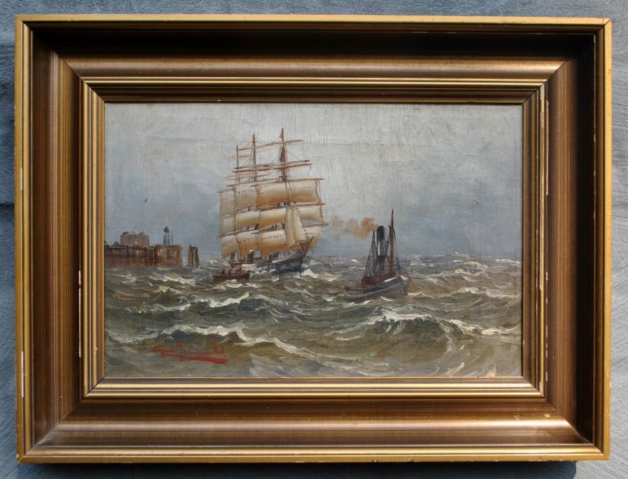Jensen, Alfred (1859 - 1935) Tyskland: Lodsen fører sejlskibet i havn. Olie på lærred. Signeret.: Alfred Jensen Prof. 36 x 24 cm.