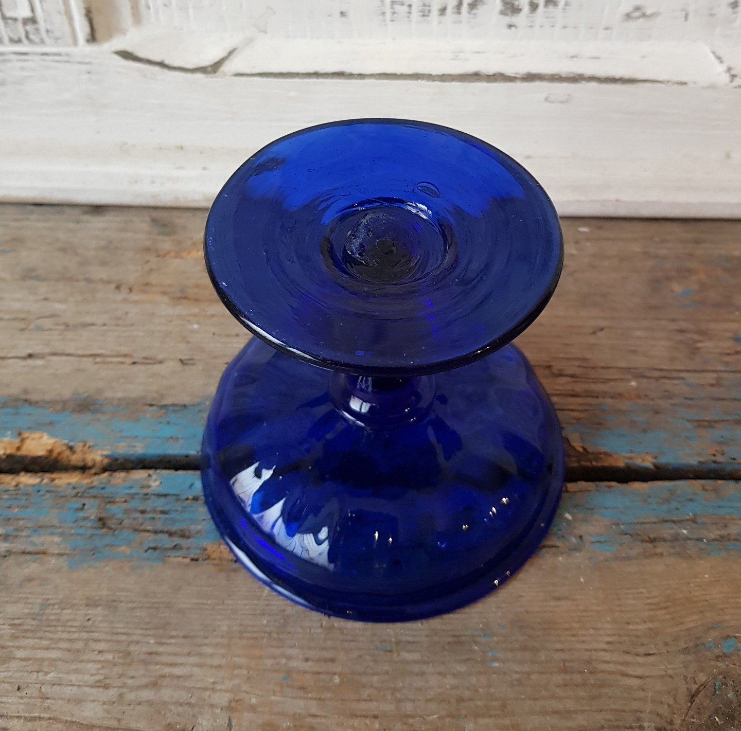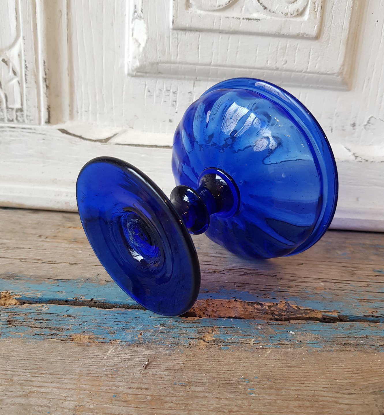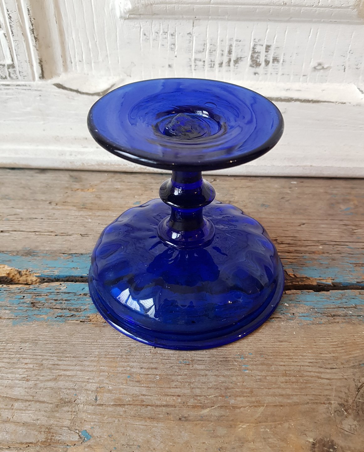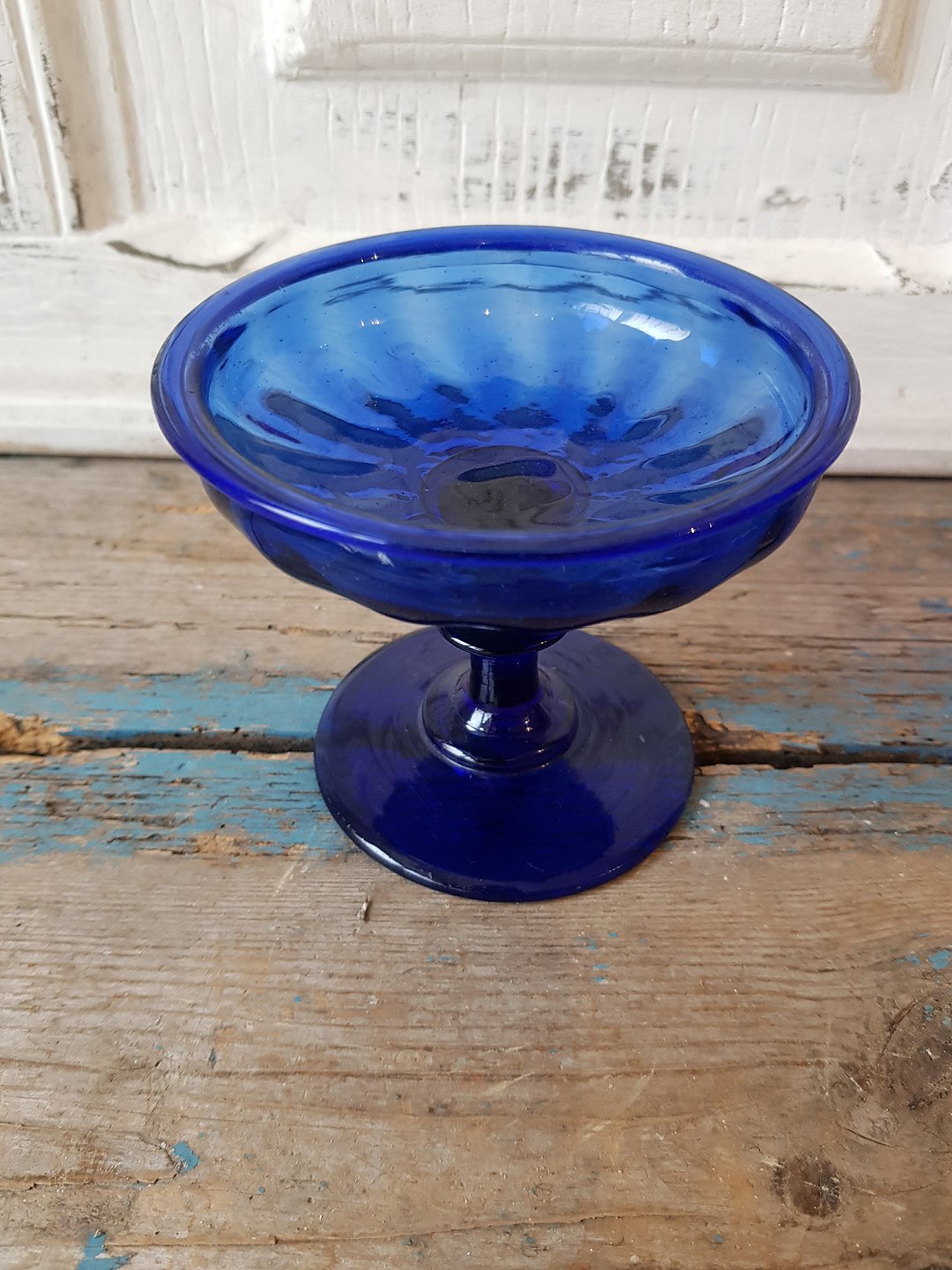 Sukkerfad i blåt glas, lav opdrevet skål med olagt kant, høj stilk med knap og stor, flad fod.