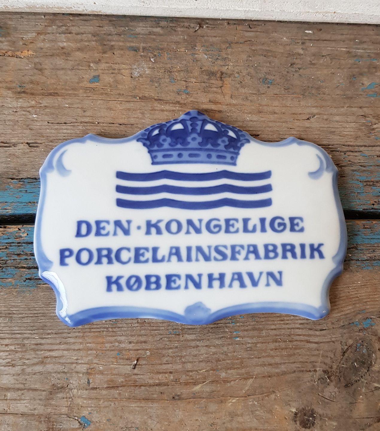 Royal Copenhagen forhandler plakette med teksten "Den Kongelige Forcelænsfabrik København"