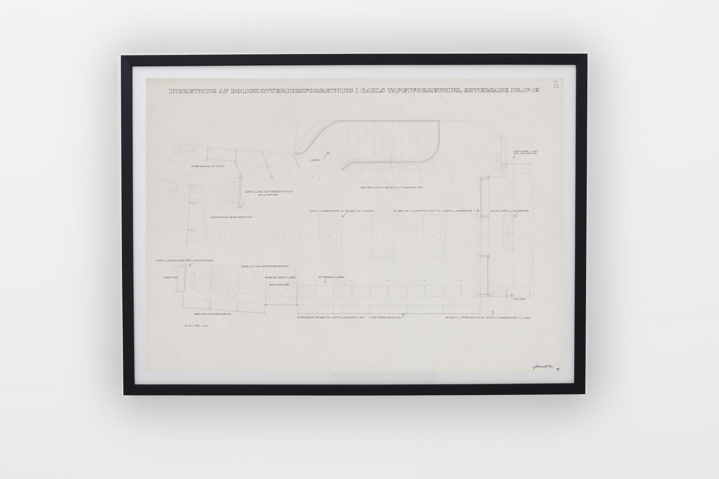 Original plantegning af 'Indretning af boligmonteringsforretning i Dahls Tapetforretning. Østergade 17-19." Proveniens: John Vedel-Riepers hjem