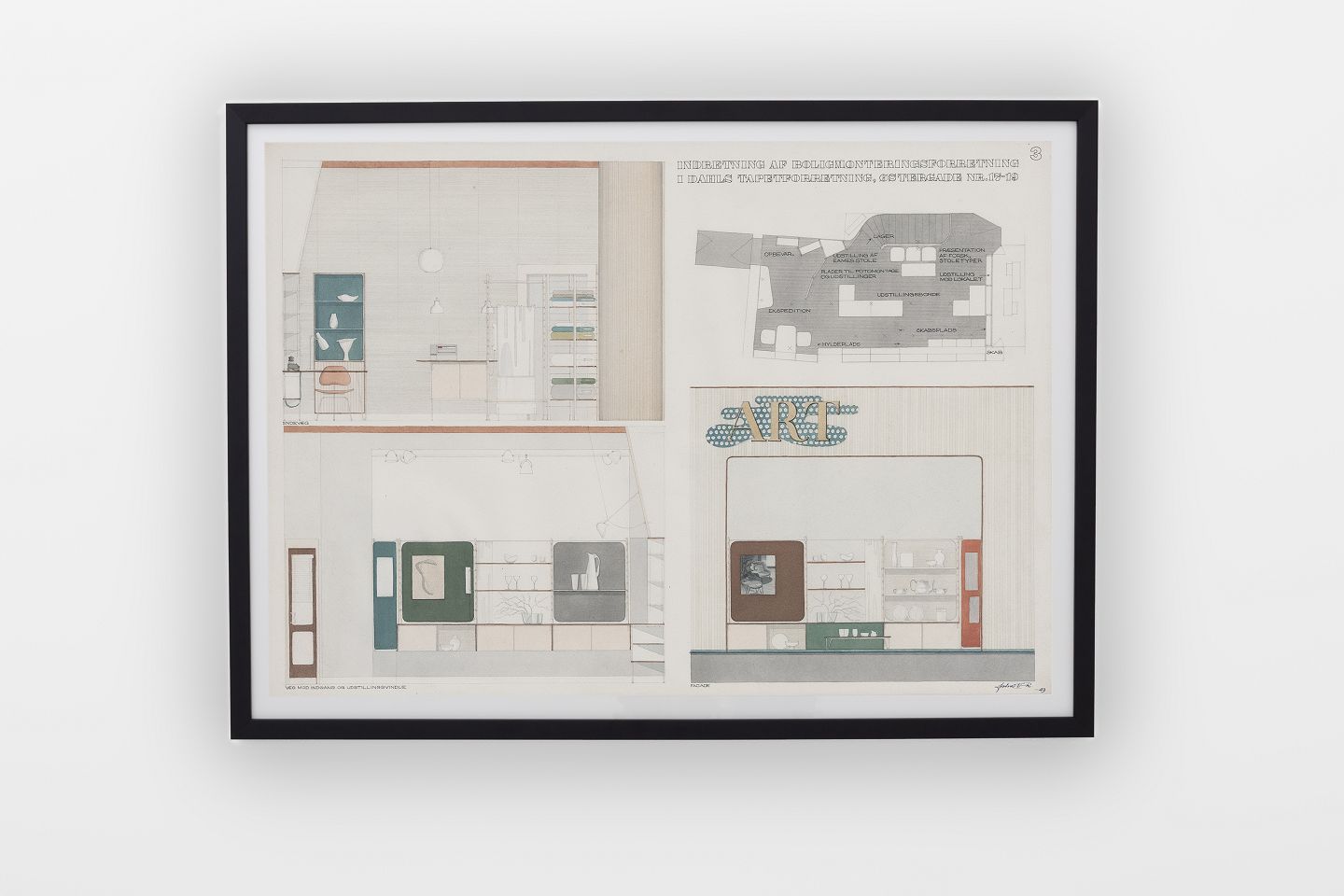 Original akvarel af 'Indretning af boligmonteringsforretning i Dahls Tapetforretning. Østergade 17-19." Signeret. Proveniens: John Vedel-Riepers hjem.
