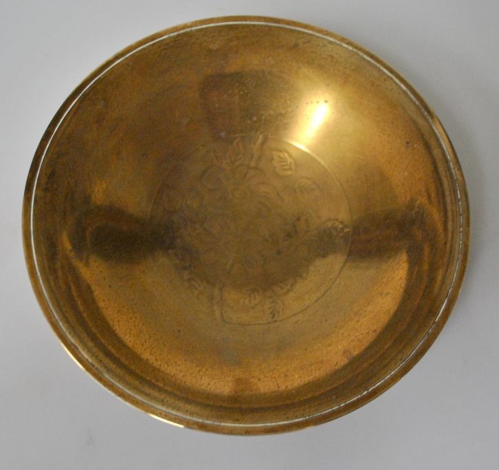 Bronze skål, 1930'erne, Danmark. Midten dekoreret med blomstermotiv. Underside patineret. Står på fodrand. Stemplet.: Ægte ildfast bronze. Dia..21 cm.