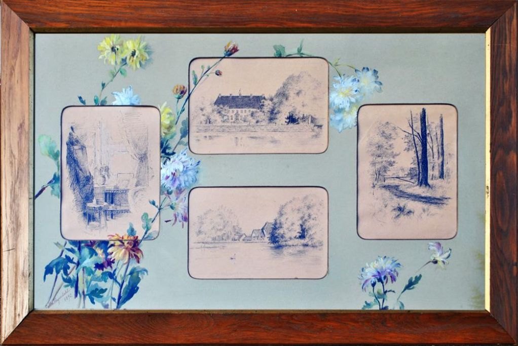 Heyerdahl, Catharine (1861 - 1952) Norge: Collage af tegninger fra en herregaard. Signeret. 52 x 84 cm.