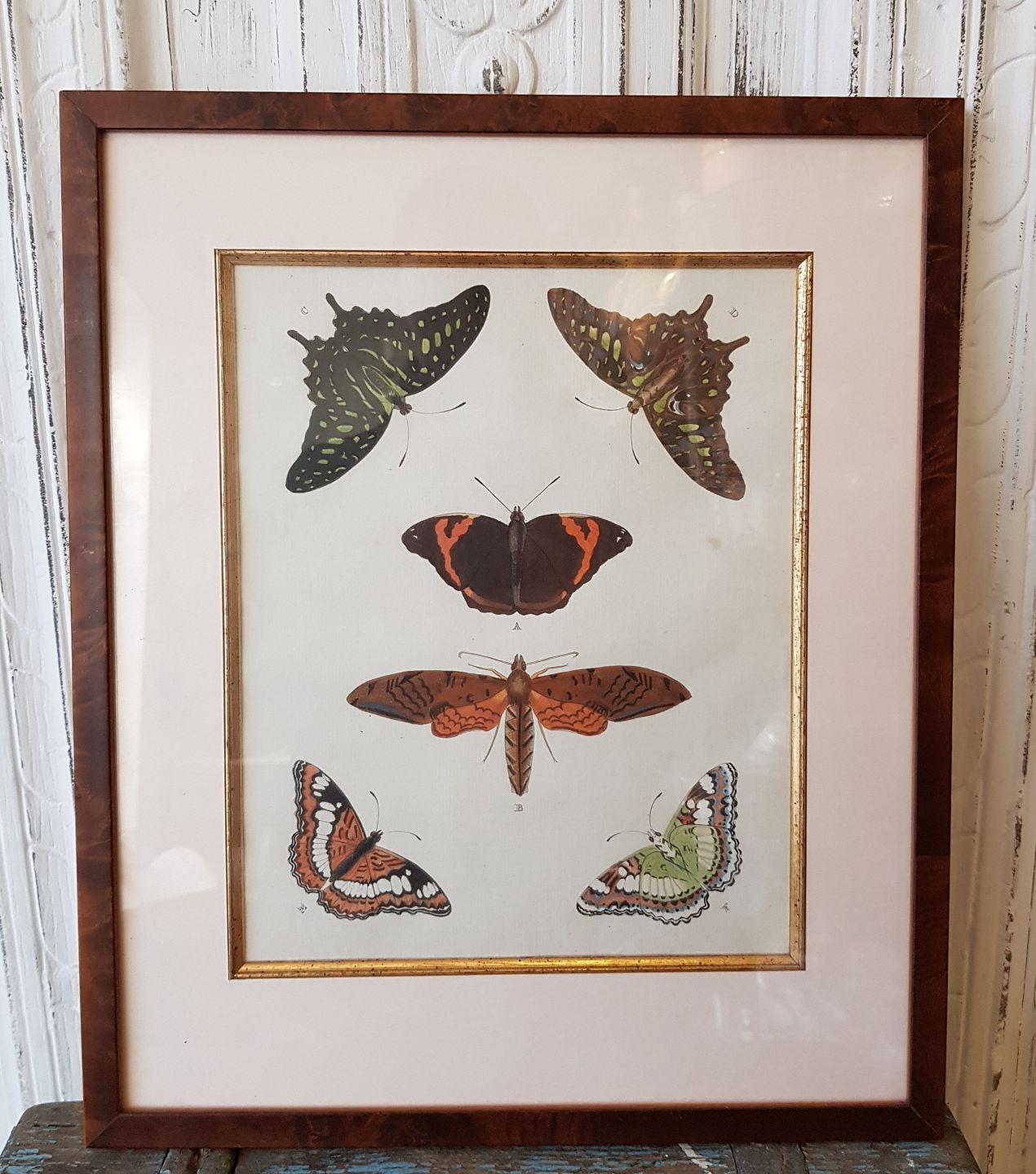 1700tals håndkoloreret tryk med sommerfugle i smuk fineret træramme.
