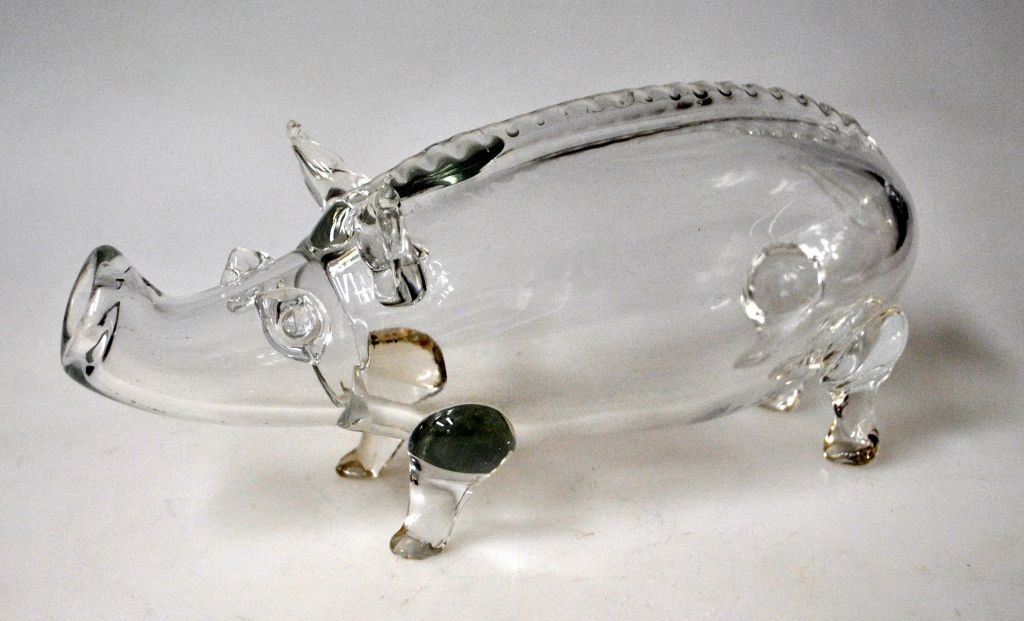 Holmegård brændevins gris. 20. årh. Danmark. Klart glas. Længde.: 23 cm.