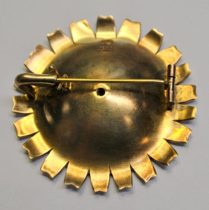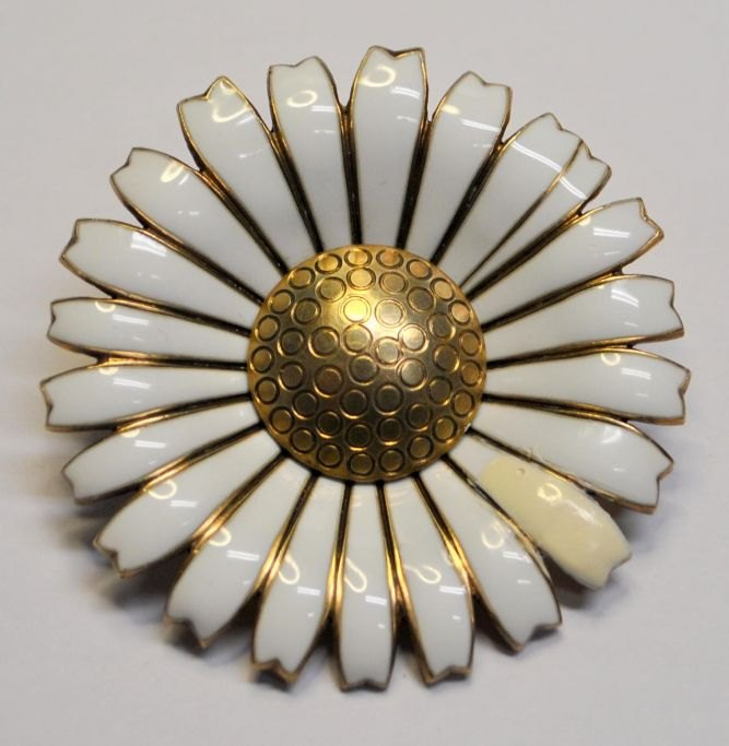 Stor Georg Jensen Daisy brosche/vedhæng, 20 årh. København, Danmark. Forgyldt sterlingsølv med emalje. Dia.: 5 cm. Stemplet.