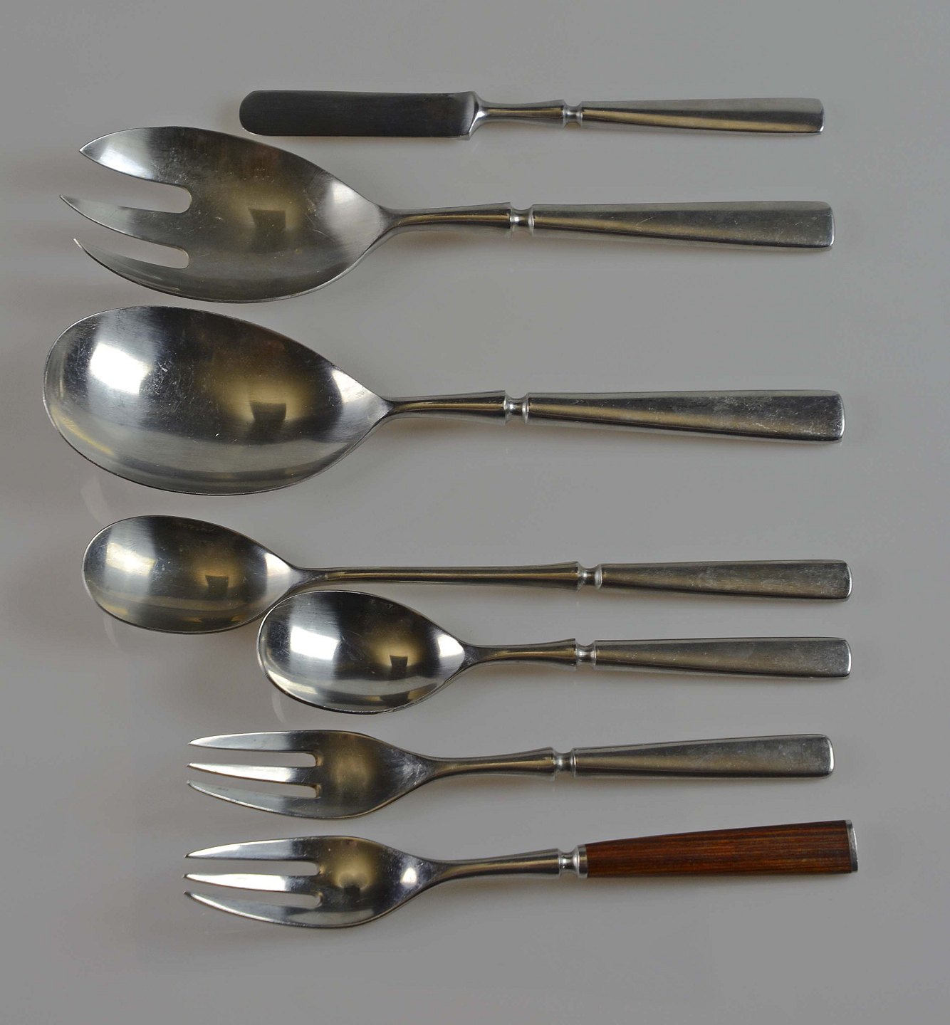 Meget sjælden bestiksæt af Jens Harald Quistgaard. Med få dele med teak skæfte ellers i stål.