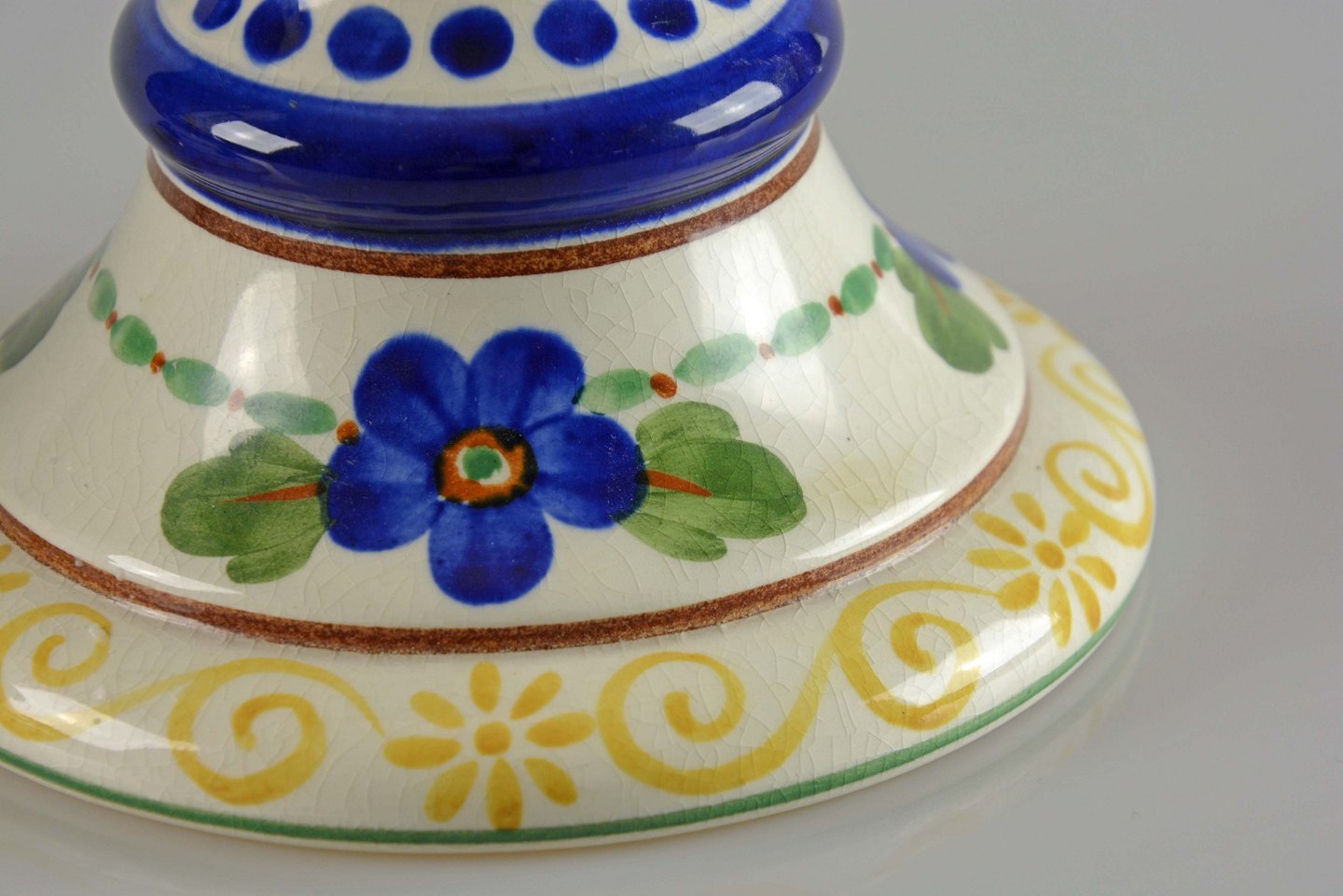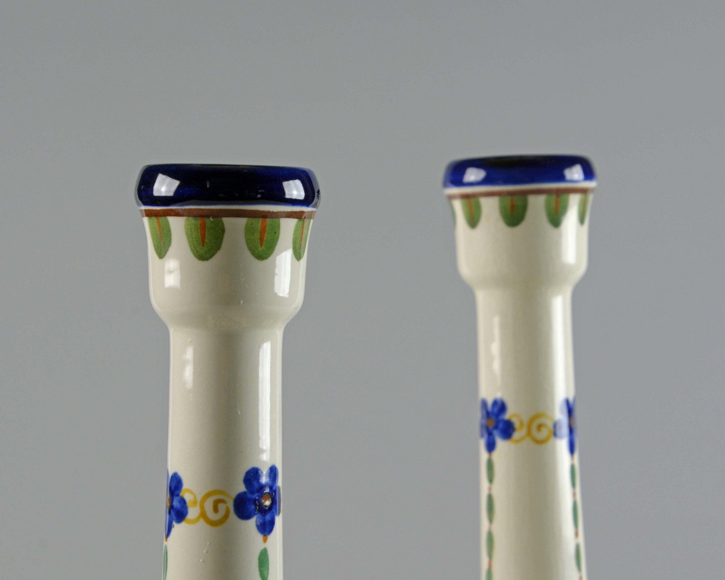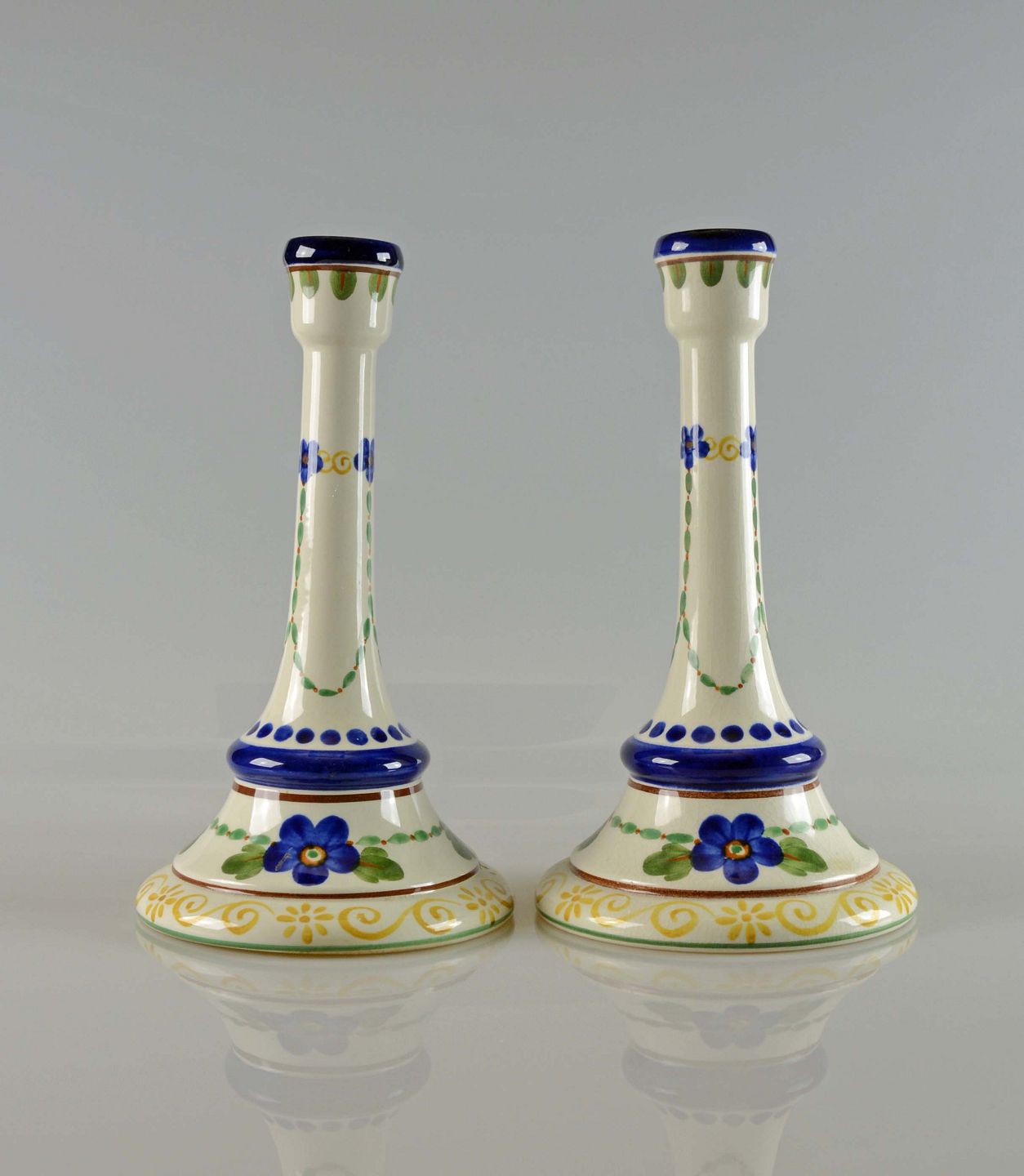 Et sæt lysestager i kunstfajance med motiv af blå blomster og gult mønster på fod.