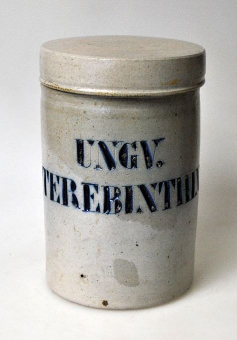 Antik apoteker krukke med låg, 19. årh. Tyskland. Gråt stentøj med blå tekst. Teksten: UNGV. TEREBINTHIN. Cylinderformet. H.: 17 cm.