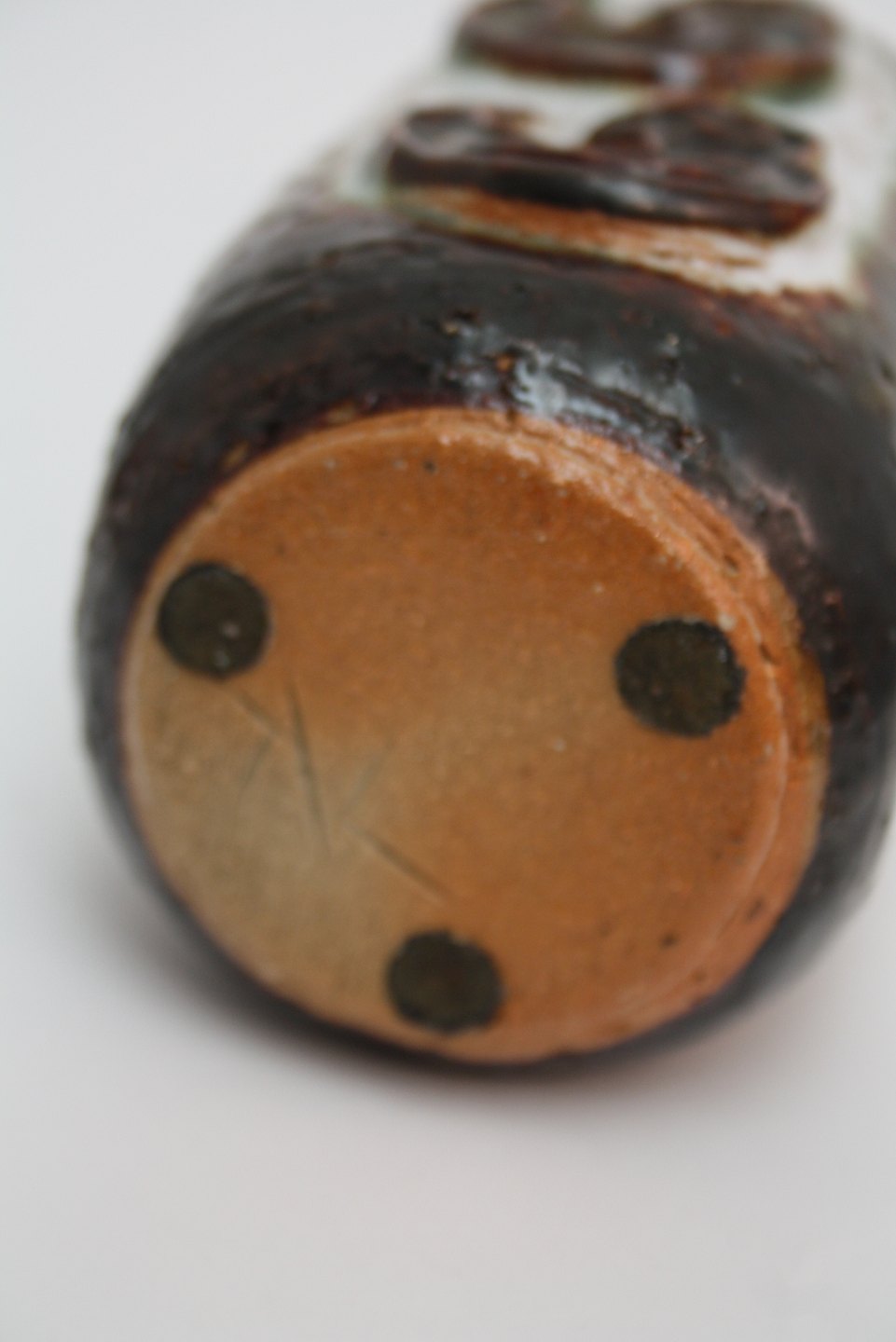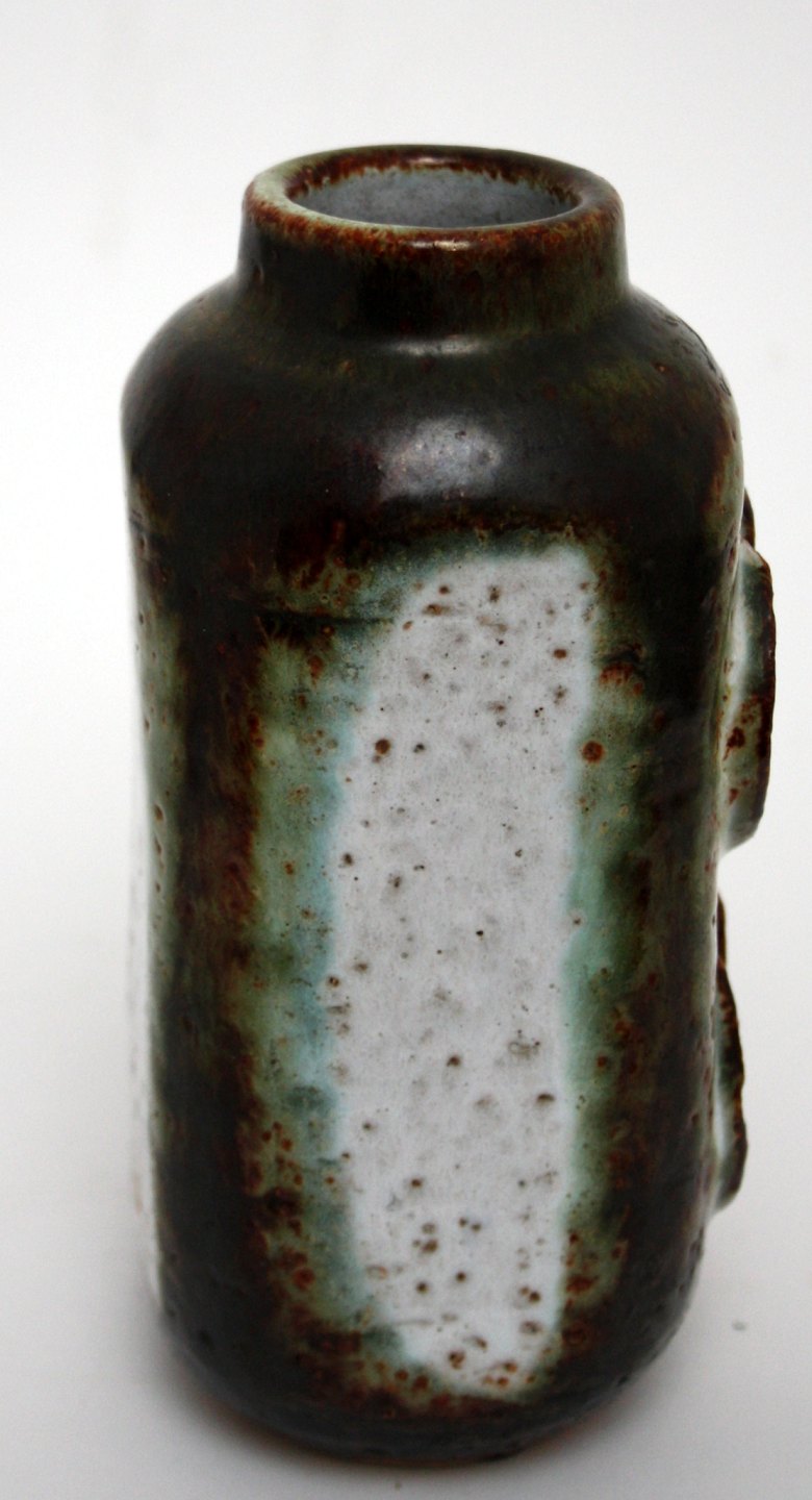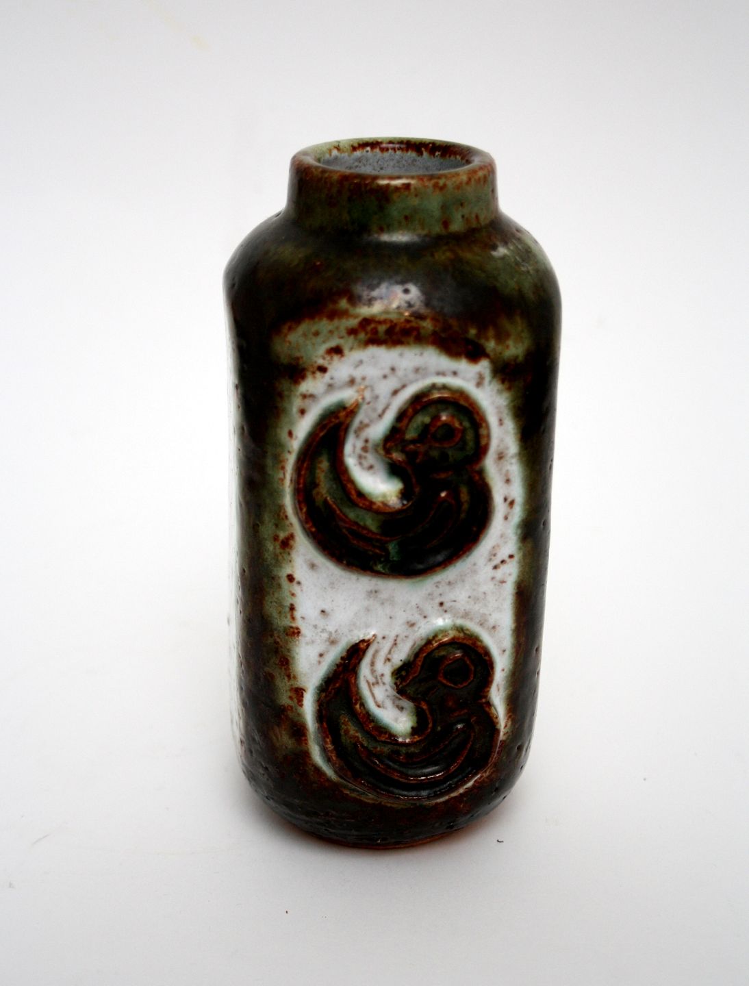 Kingo Keramik, Fyn, Vase med ænder hvid/brun glasur. Signeret KK. Højde 22 cm. Diameter 17 cm. Flot stand. Pris: 375 kr.