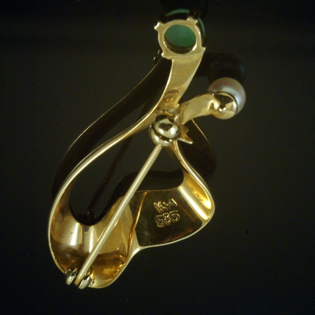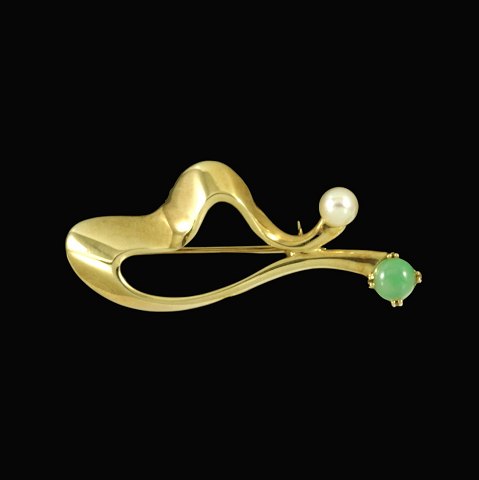 Knud V. Andersen. 14k Gold Brooch with Jade and Pearl.