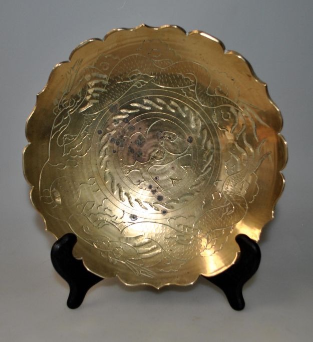 Kinesisk bronze fad, 19/20. årh. Dekoreret med drage. Med flæset kant. Dia.: 20 cm. Stemplet: China.