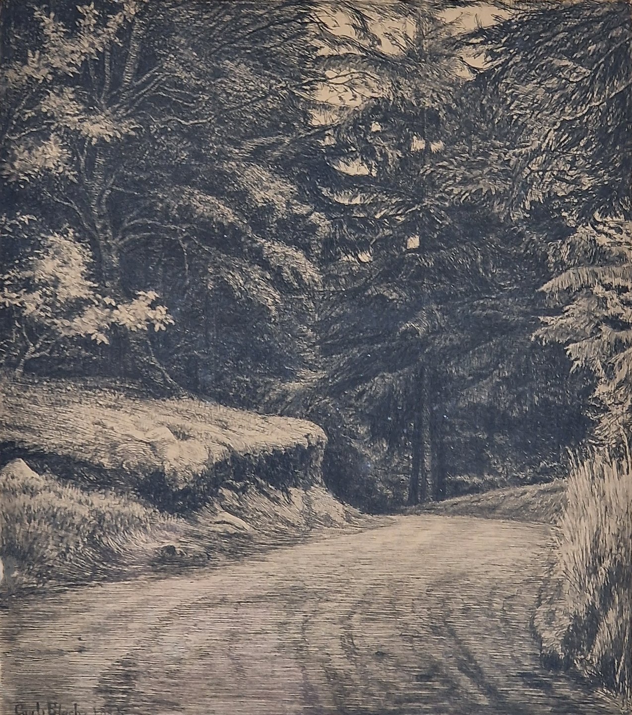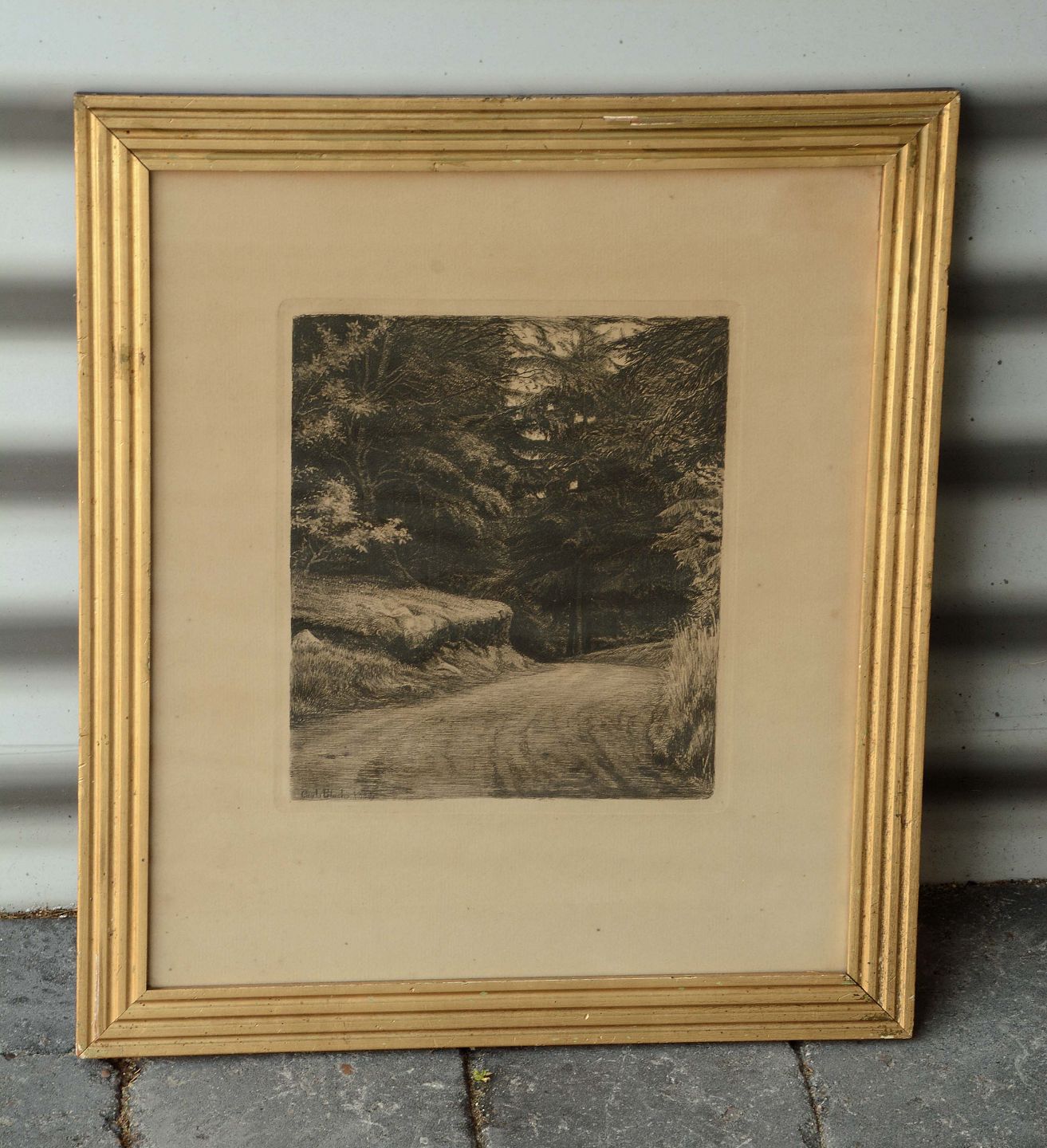 Indrammet radering i guldmalet træramme med motiv af skovsti