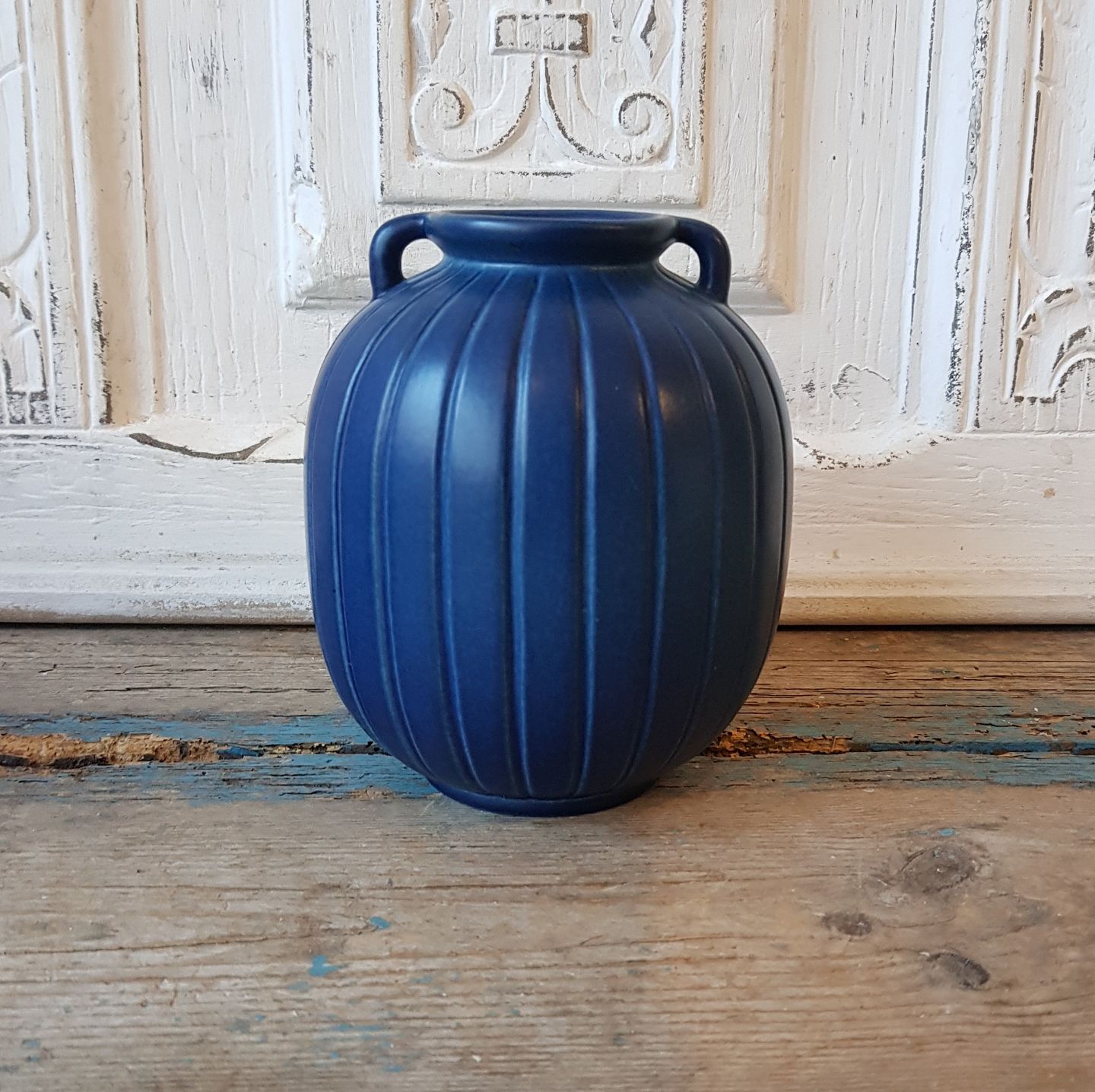 Ipsens enke riflet vase med blå glasur 14 cm.