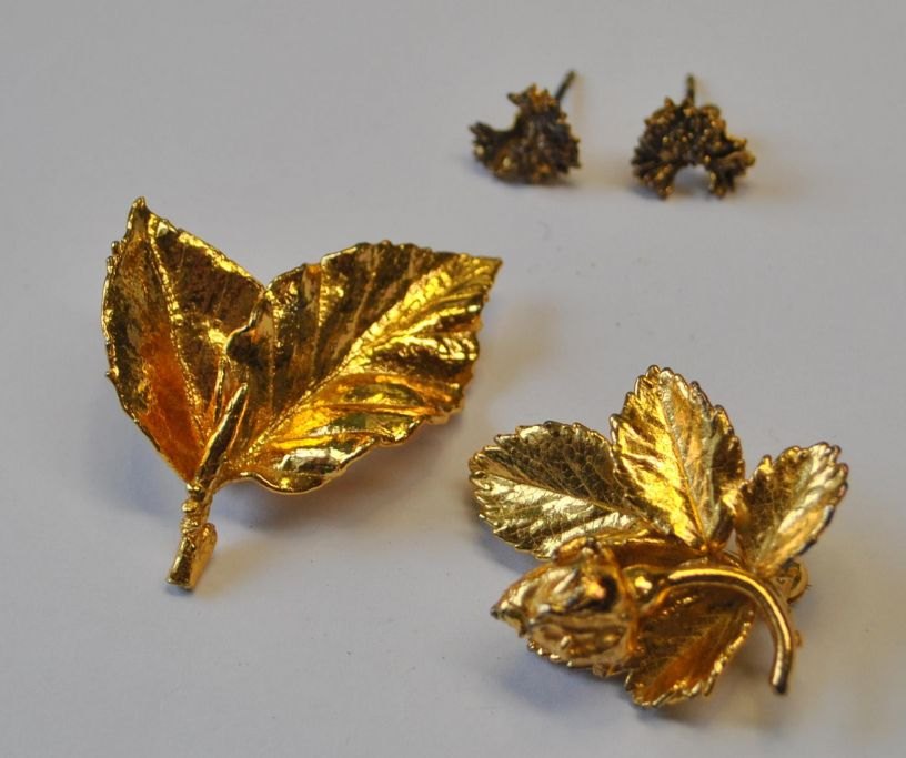 Flora Danice jewelry set, gilded sterling silver, 20th century Denmark. Consisting of 2 brooches and a pair of ear sticks.