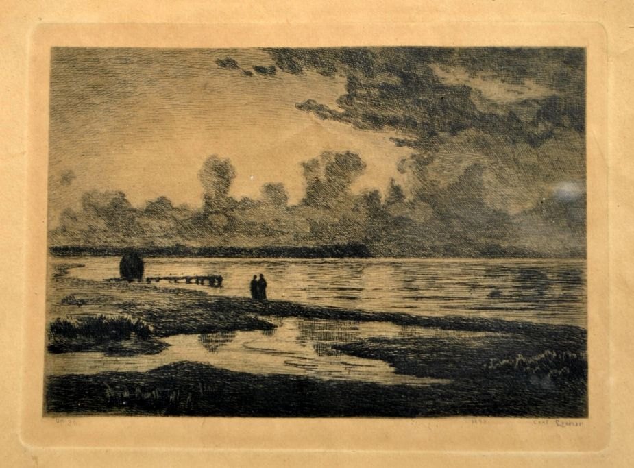 Locher, Carl ( 1851 - 1915) Danmark: Sommernat ved Hornbæk Strand. Radering Opus 36. Signeret 1898. 16,5 x 22 cm.