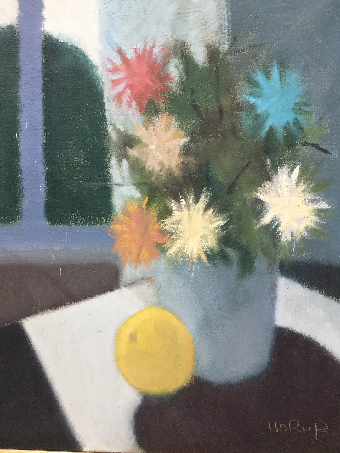 Maleri af Knud Horup - Opstilling ved vindue - vase med blomster og frugt.