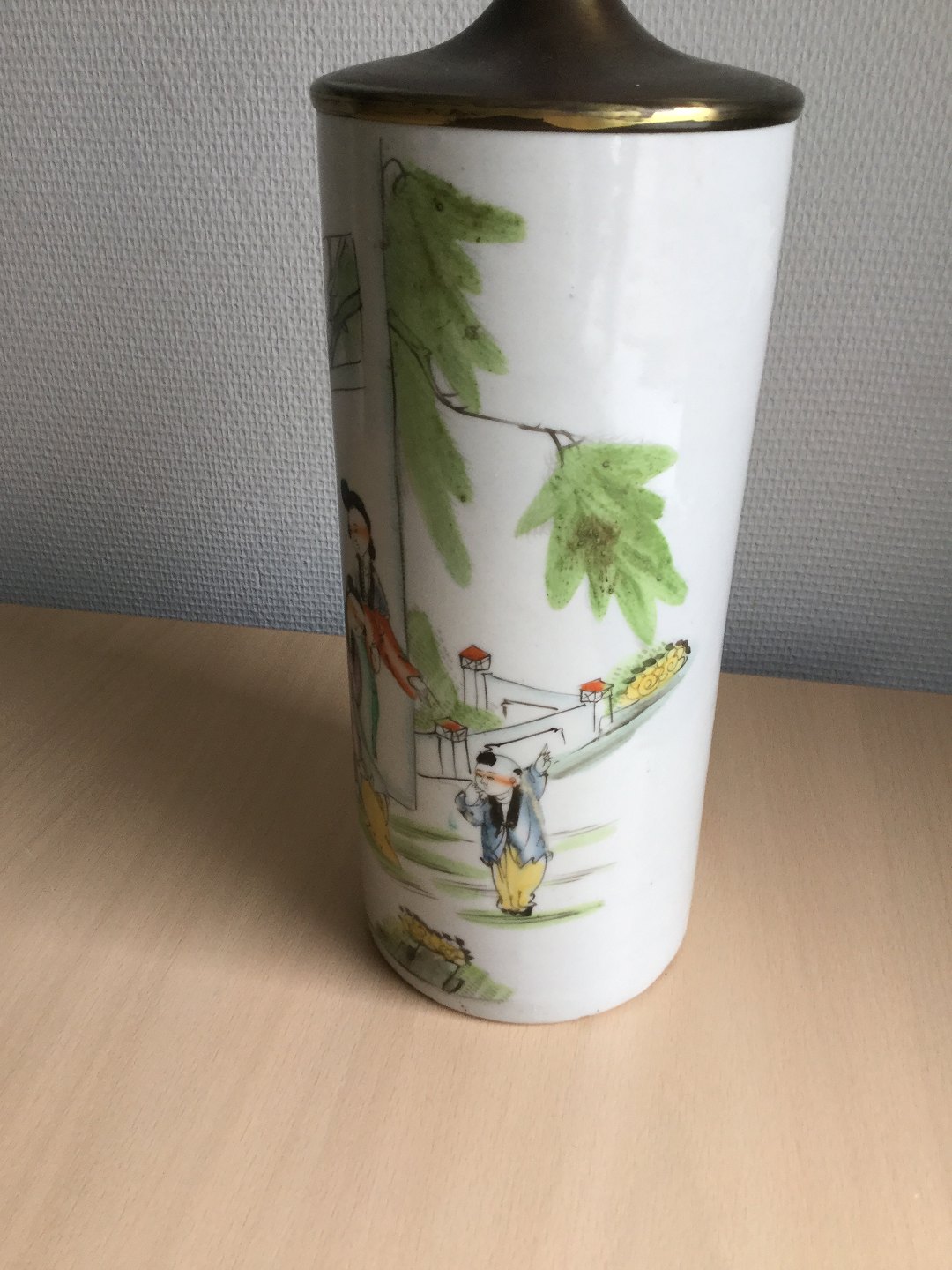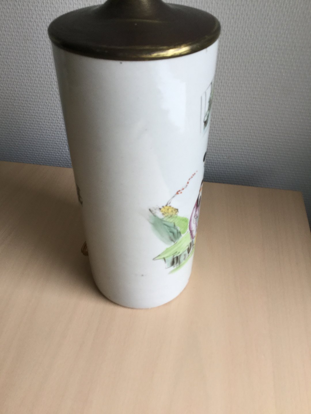 Polykromt dekoreret med personer i landskab.