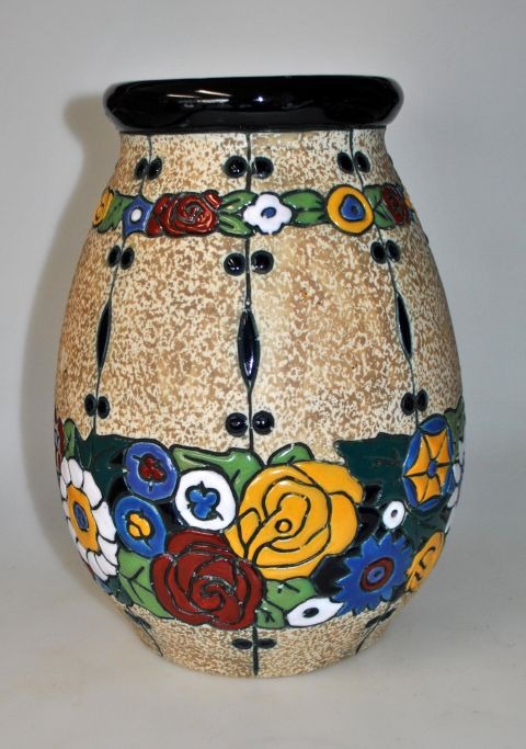 Czech faience vase, o. 1910. Amphora. Jugend. Mass with polychrome overlay in cobalt, red, blue, white, green, light green and yellow. Decoration in the form of different colored flowers and leaves. H: 28 cm. Stamped in bottom and production number: 6069.