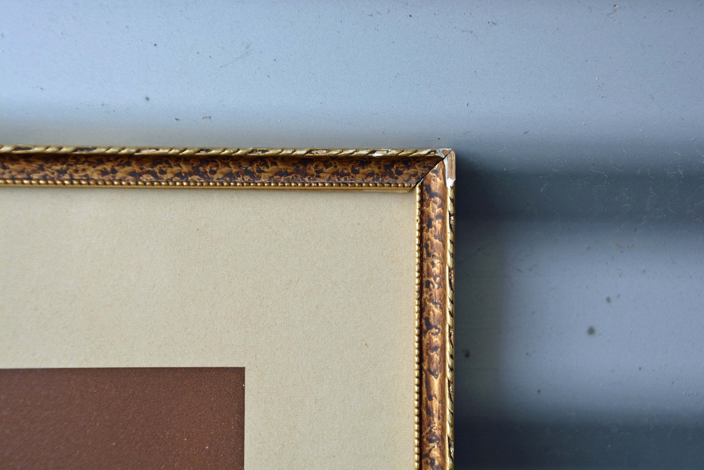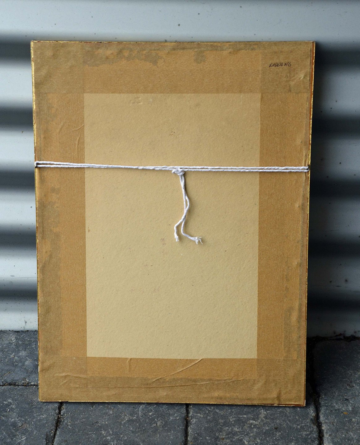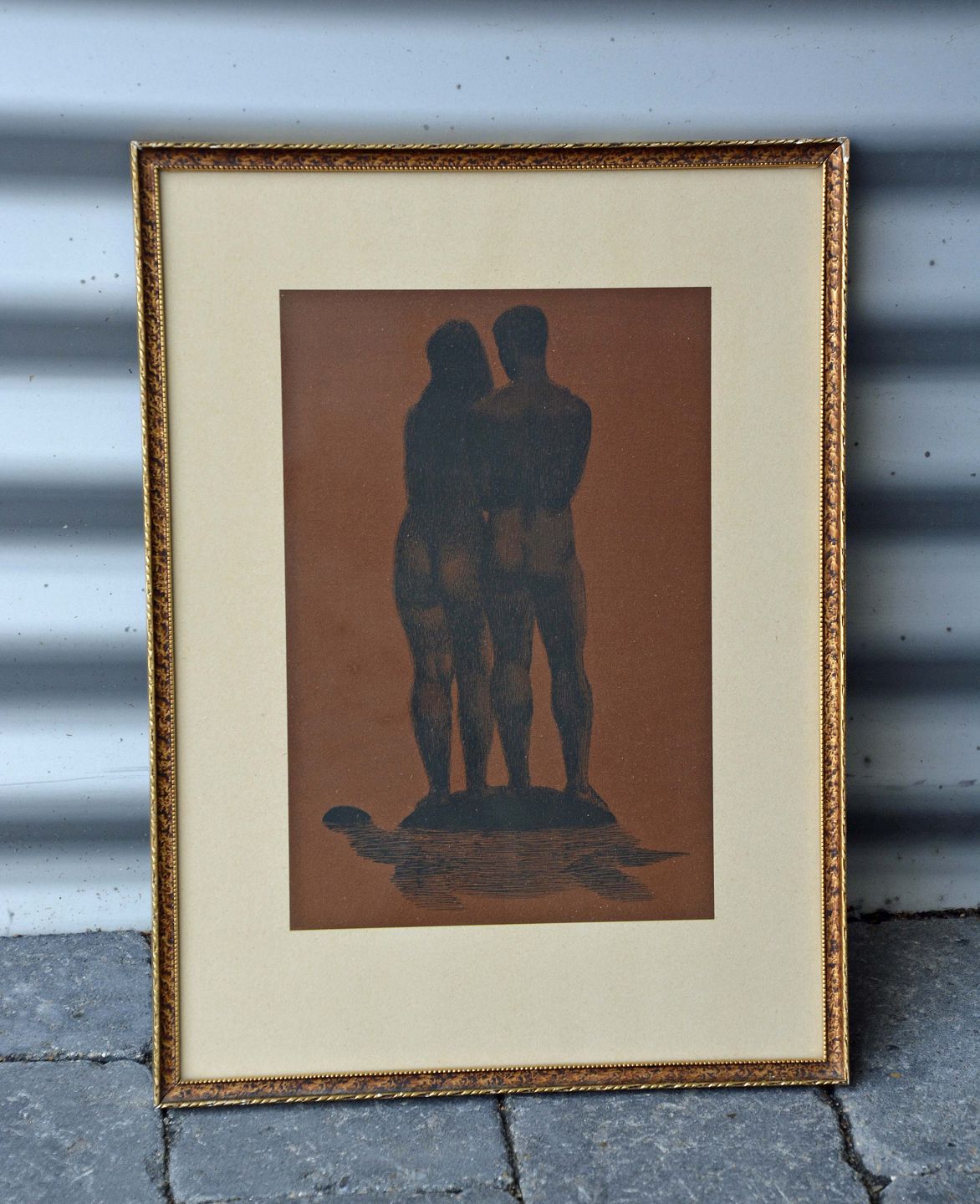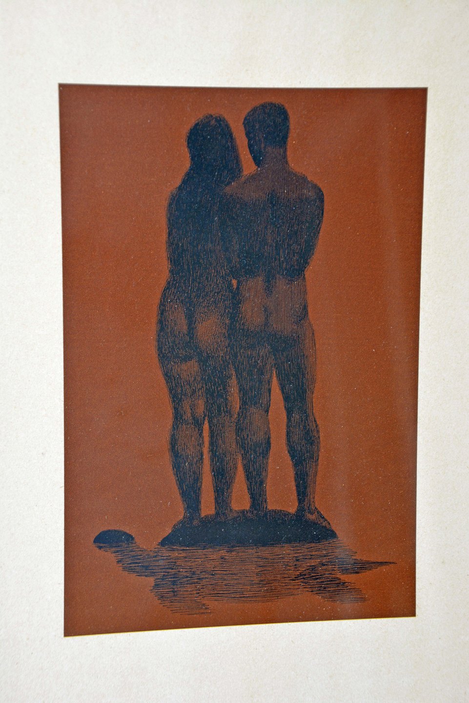Radering med motiv af mand og kvinde stående på skildpadde.