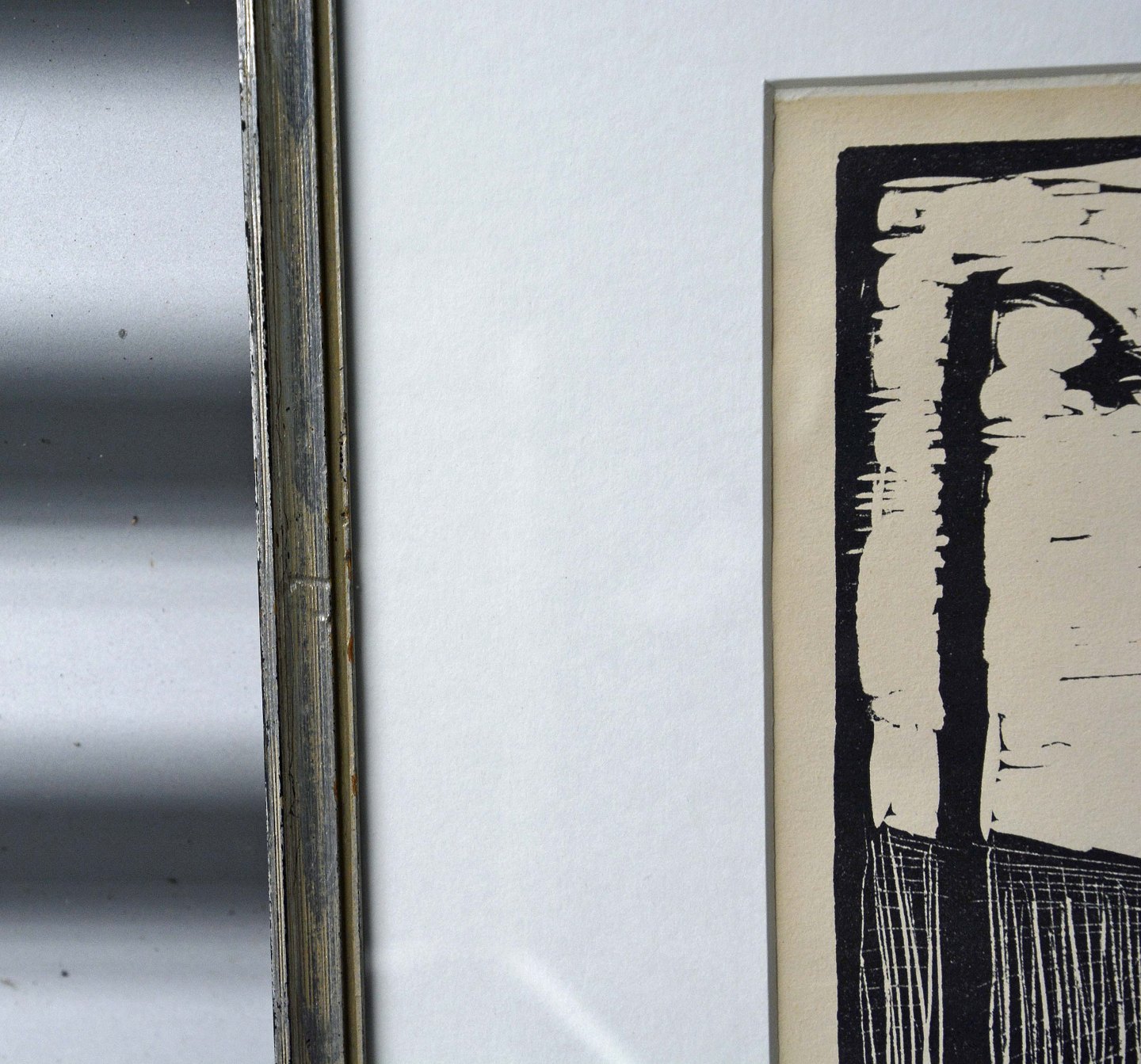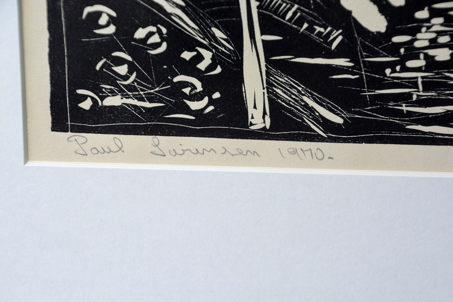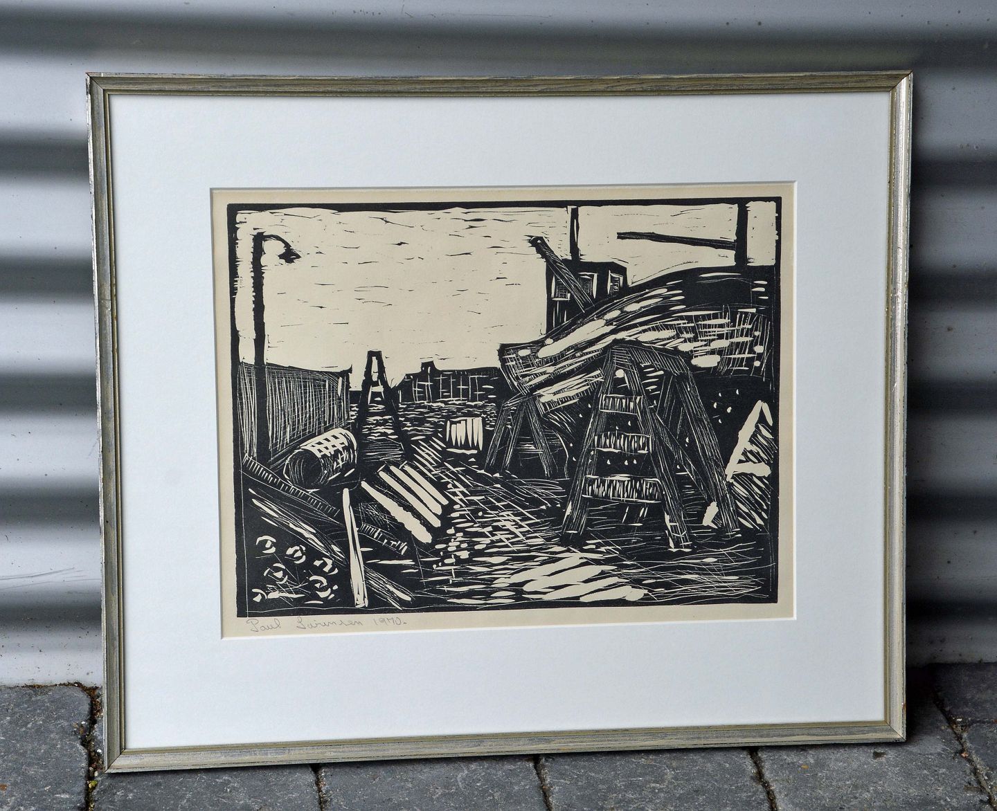 Indrammet træsnit i sølvmalet træramme med motiv af fiskebåd på land ved Frederikshavn