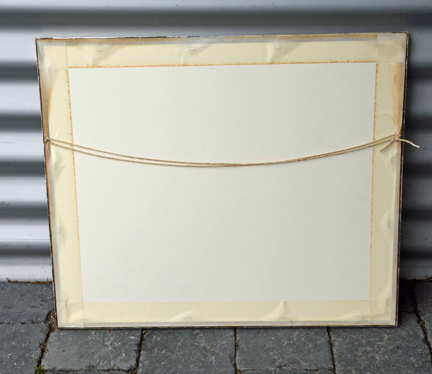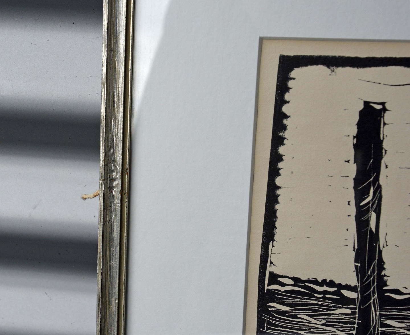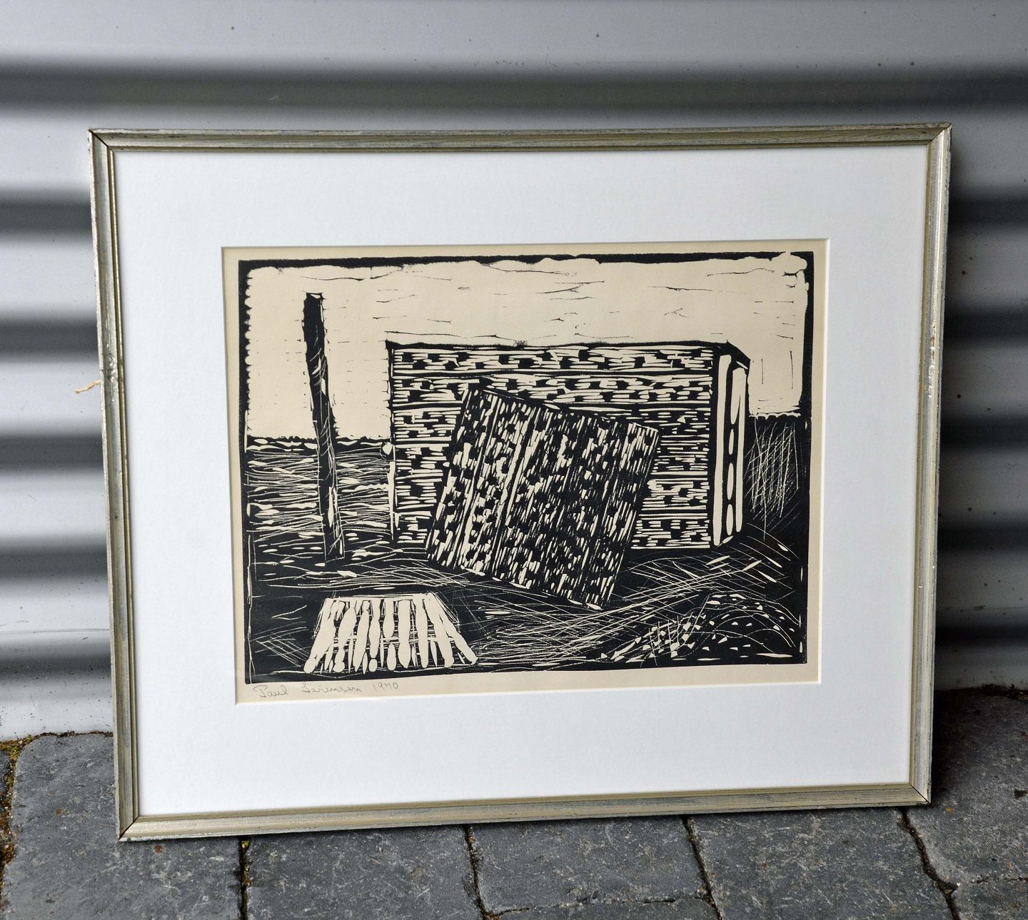 Indrammet træsnit i sølvmalet træramme med abstrakt motiv af fiskekasser. Motivet er formentlig fra Frederikshavn.